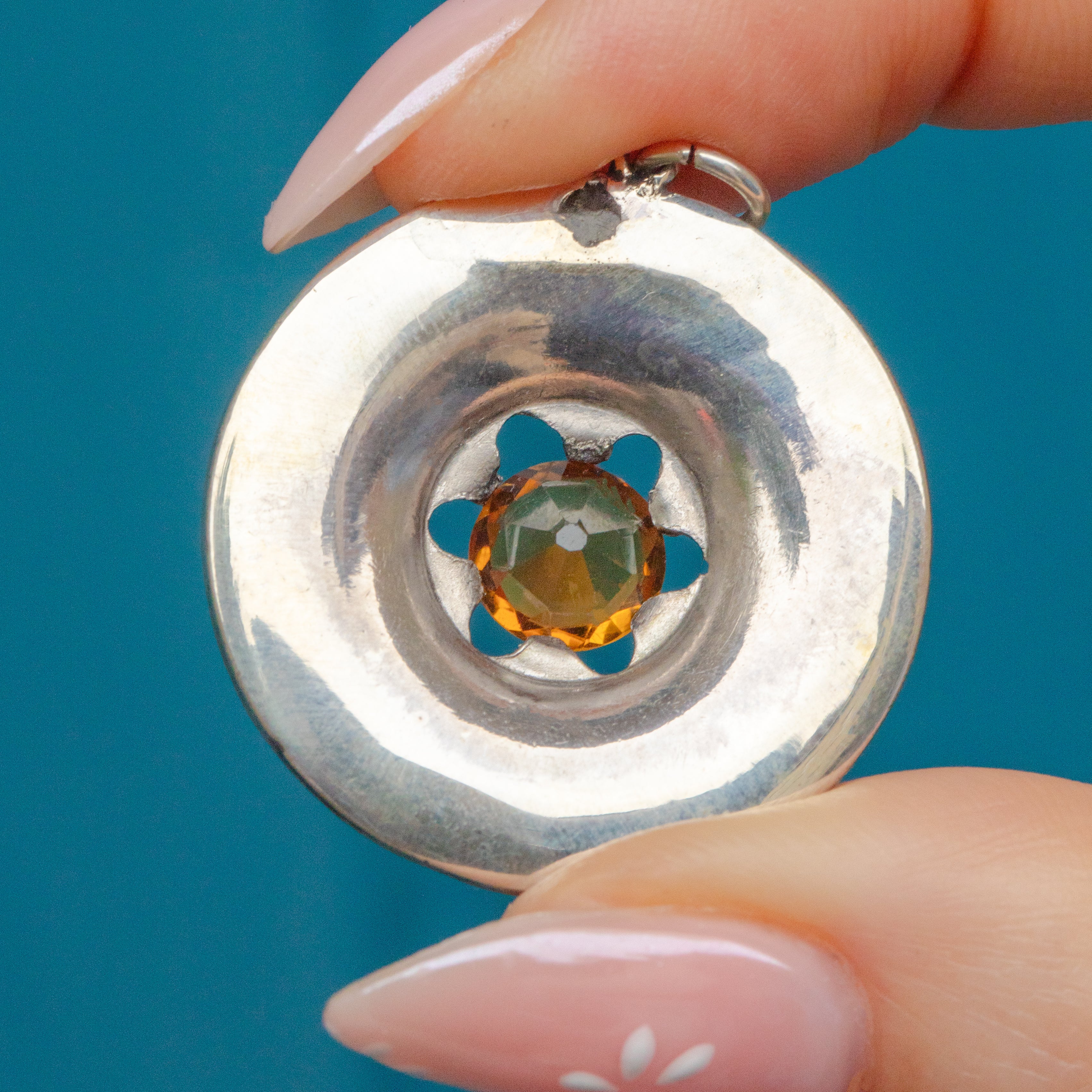 VERY GOOD. Offered in very good condition, this Victorian Scottish Agate Citrine round pendant is delightful! Her Sterling Silver has a lovely luster and securely holds the gemstones. As each of her stones has closed-back settings, it is important to note that you should not get this piece wet, as this can seep behind the stones and damage them. A loving conversion from a brooch, there is some evidence of this on the back near the jump ring, but this cannot be seen when worn. At the centre to the back there is also a slightly darker tone to the Silver, but this does not affect her overall beauty. A feast for the eyes, this Victorian pendant is a real statement piece!
