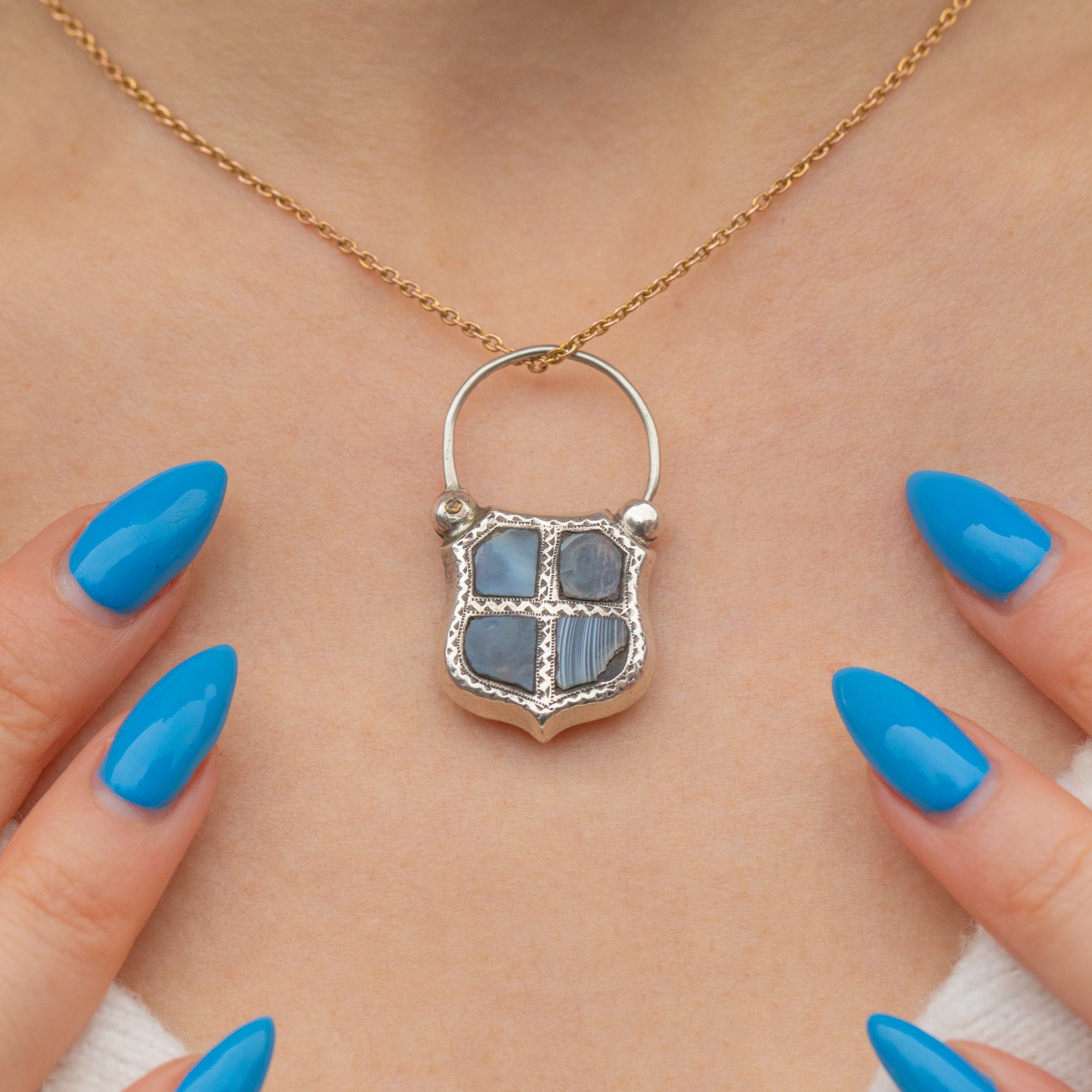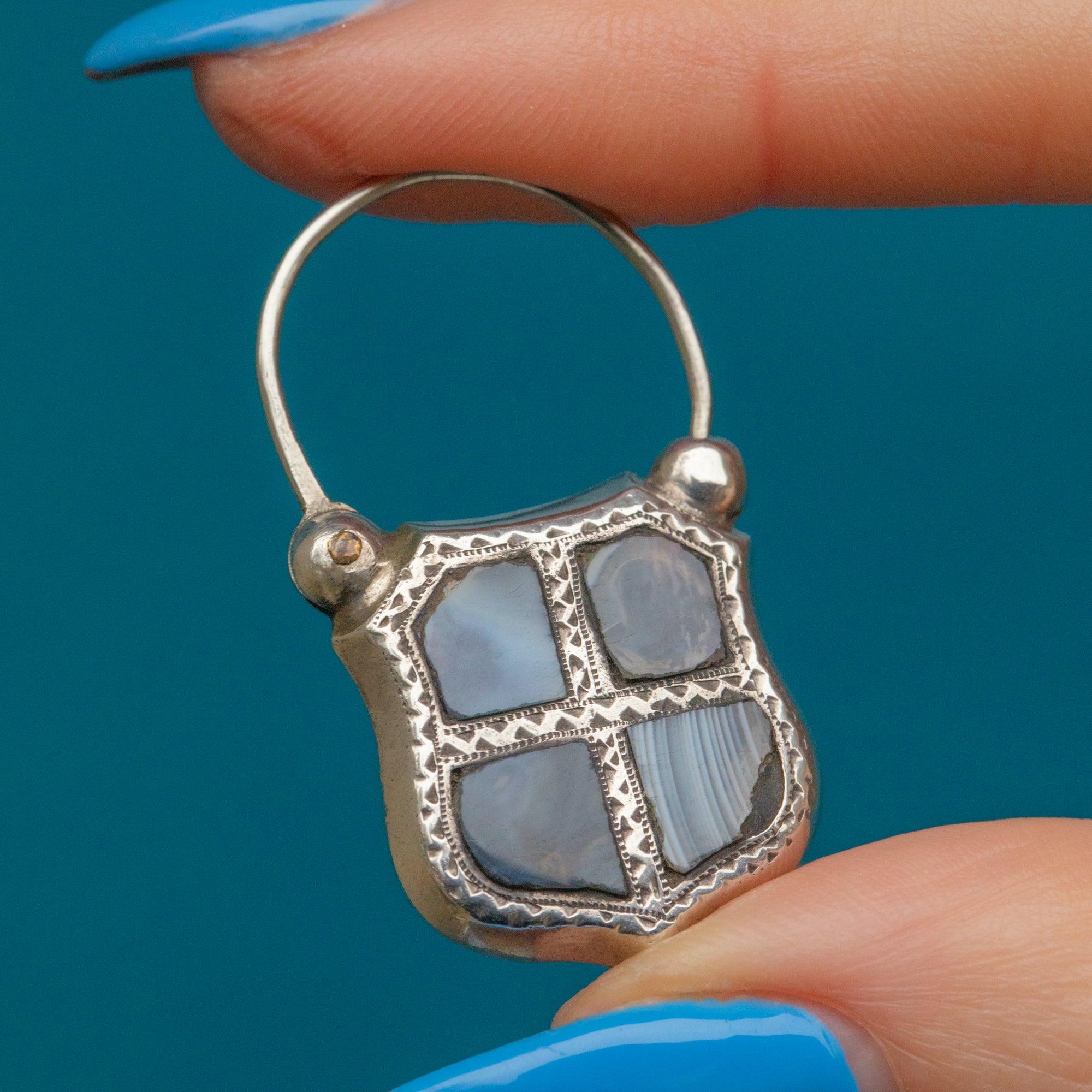 GOOD-VERY GOOD. This Victorian Silver Agate padlock pendant is in lovely antique condition. The Agate have all been hand-cut, and as such aren't a perfect fit for the settings, but they remain secure and we feel this gives the pendant a little extra antique character. The bottom right stone has a chip, but this is only visible under close inspection and the other three are free from signs of wear. The padlock has retained its form remarkably well over the years, with only some minor surface wear on the back, and the Silver is bright with a light patina emphasising the engraved details. The padlock arm works perfectly allowing you to style this piece however you choose and wear it with the utmost confidence!