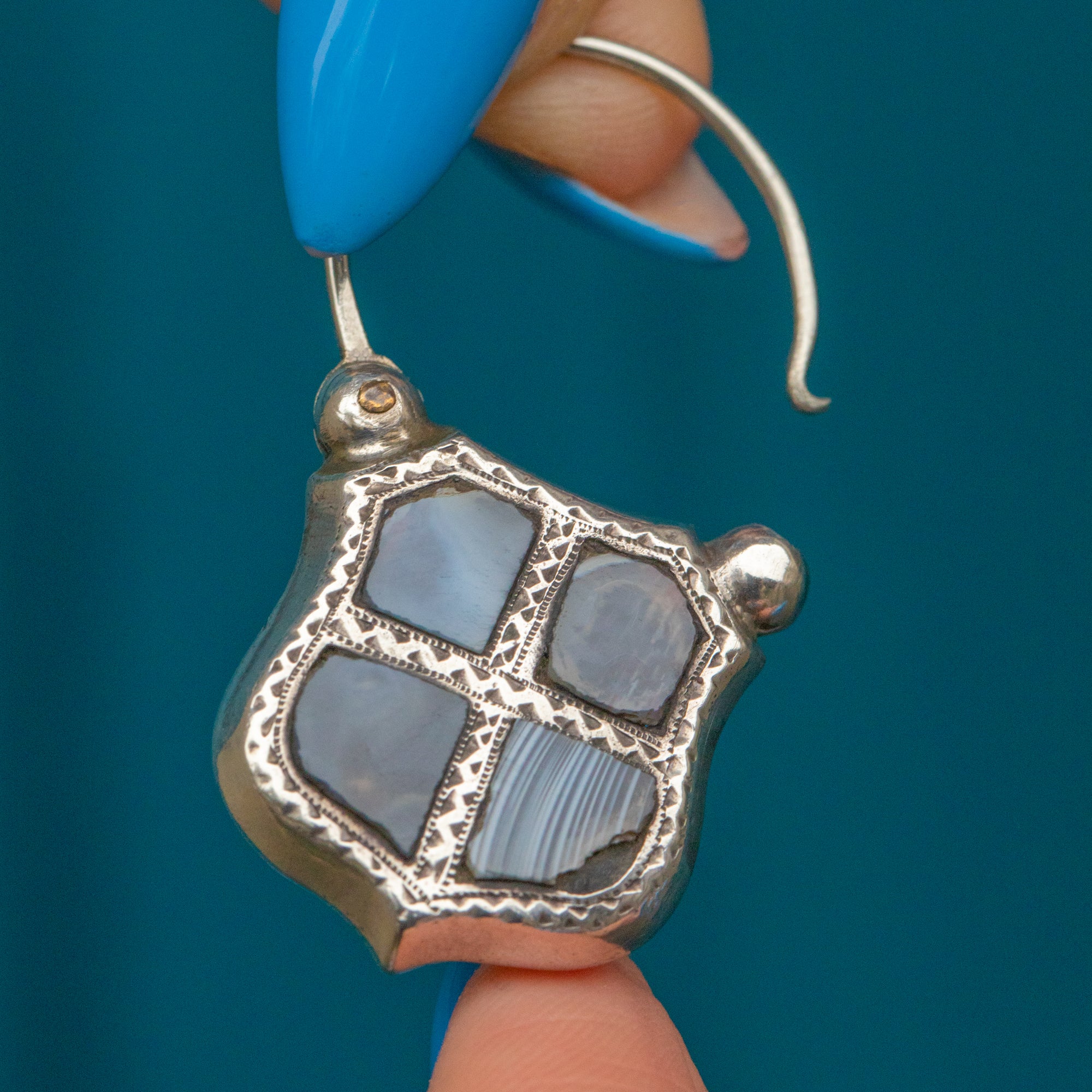 Exquisitely crafted and sure to make an impact, this Victorian Silver Agate padlock pendant will make a wonderful addition to your collection! The bold design of this antique padlock will instantly grab your attention, with its four slices of hand-cut Agate displaying varying monochrome patterns, perfectly complimented by lustrous Silver with a moody patina.