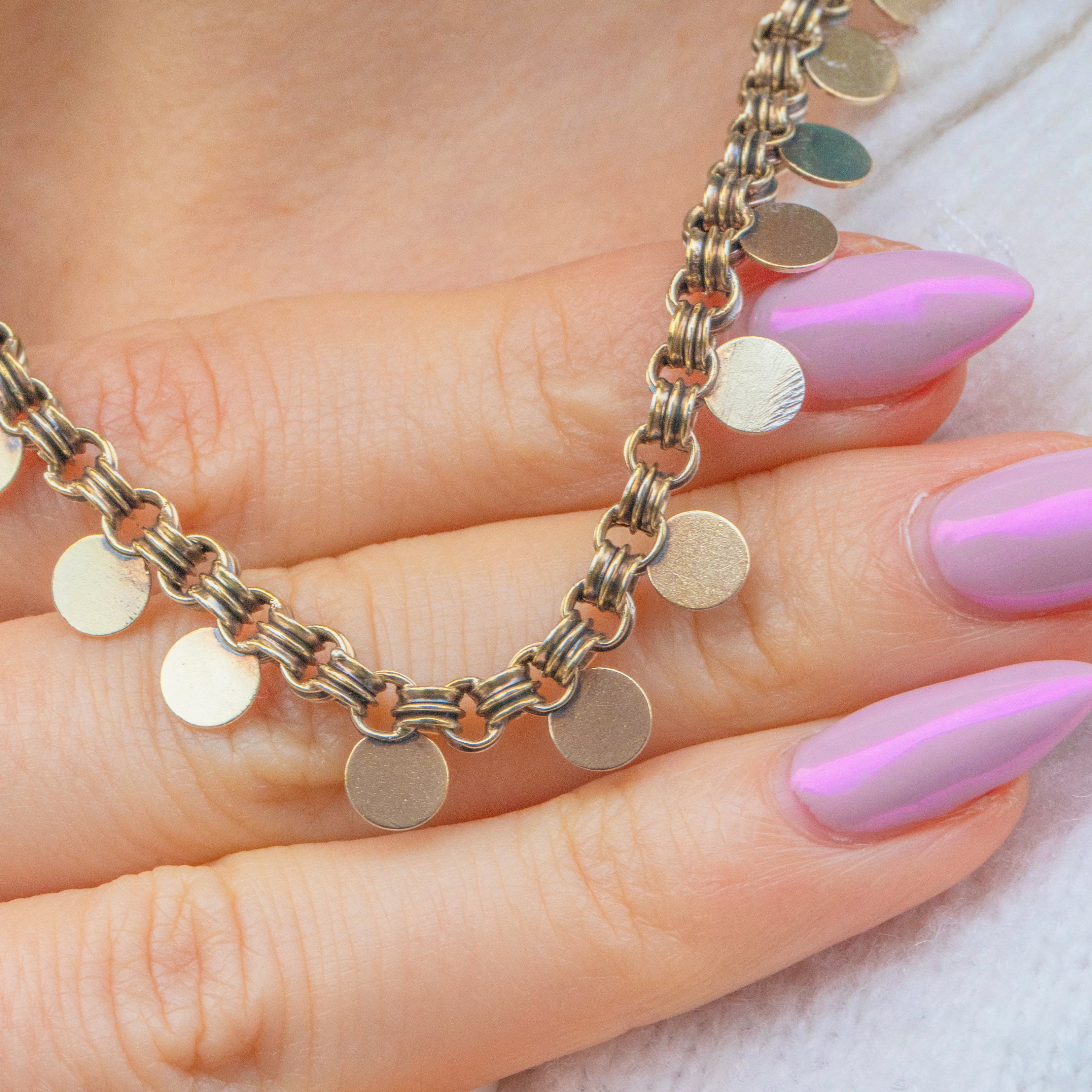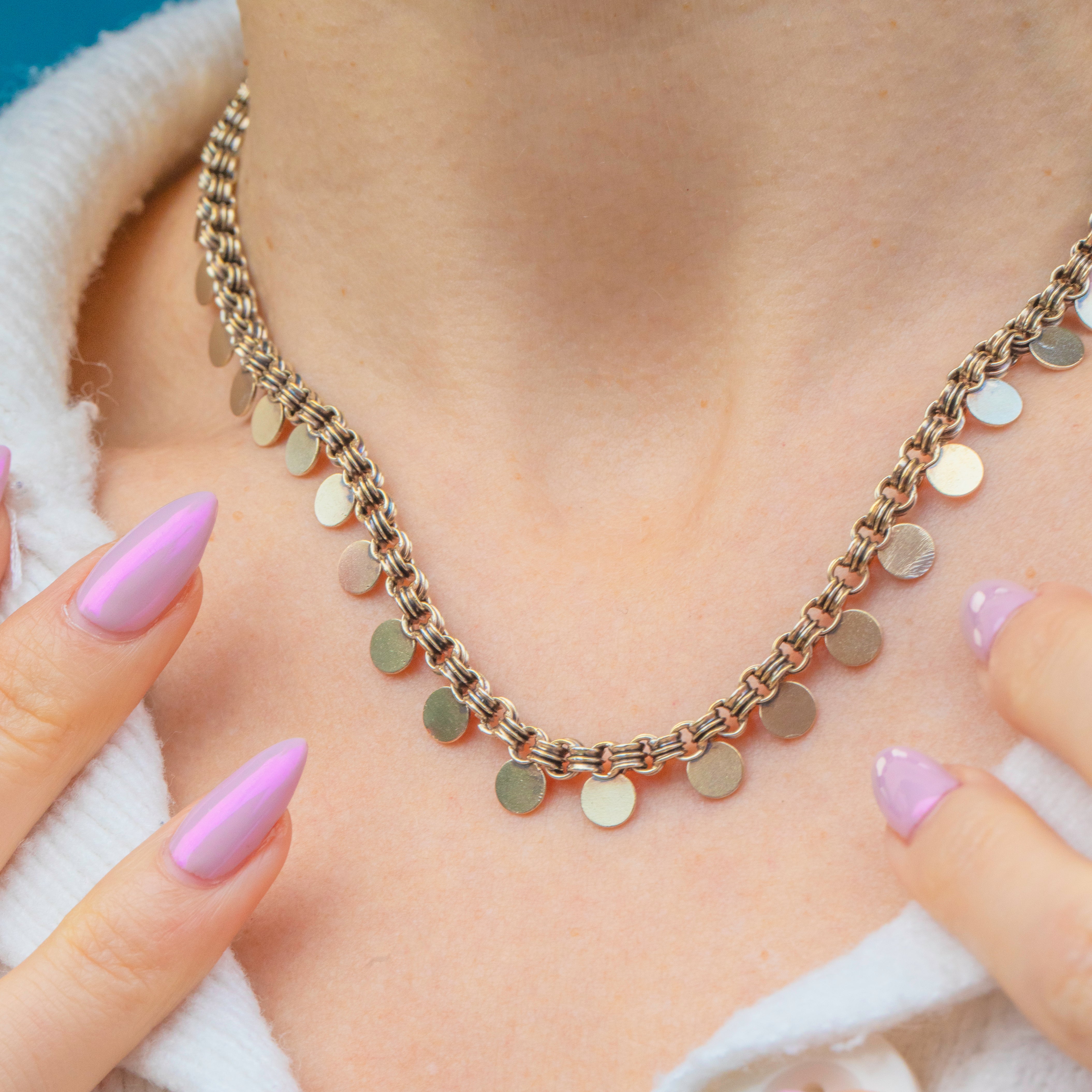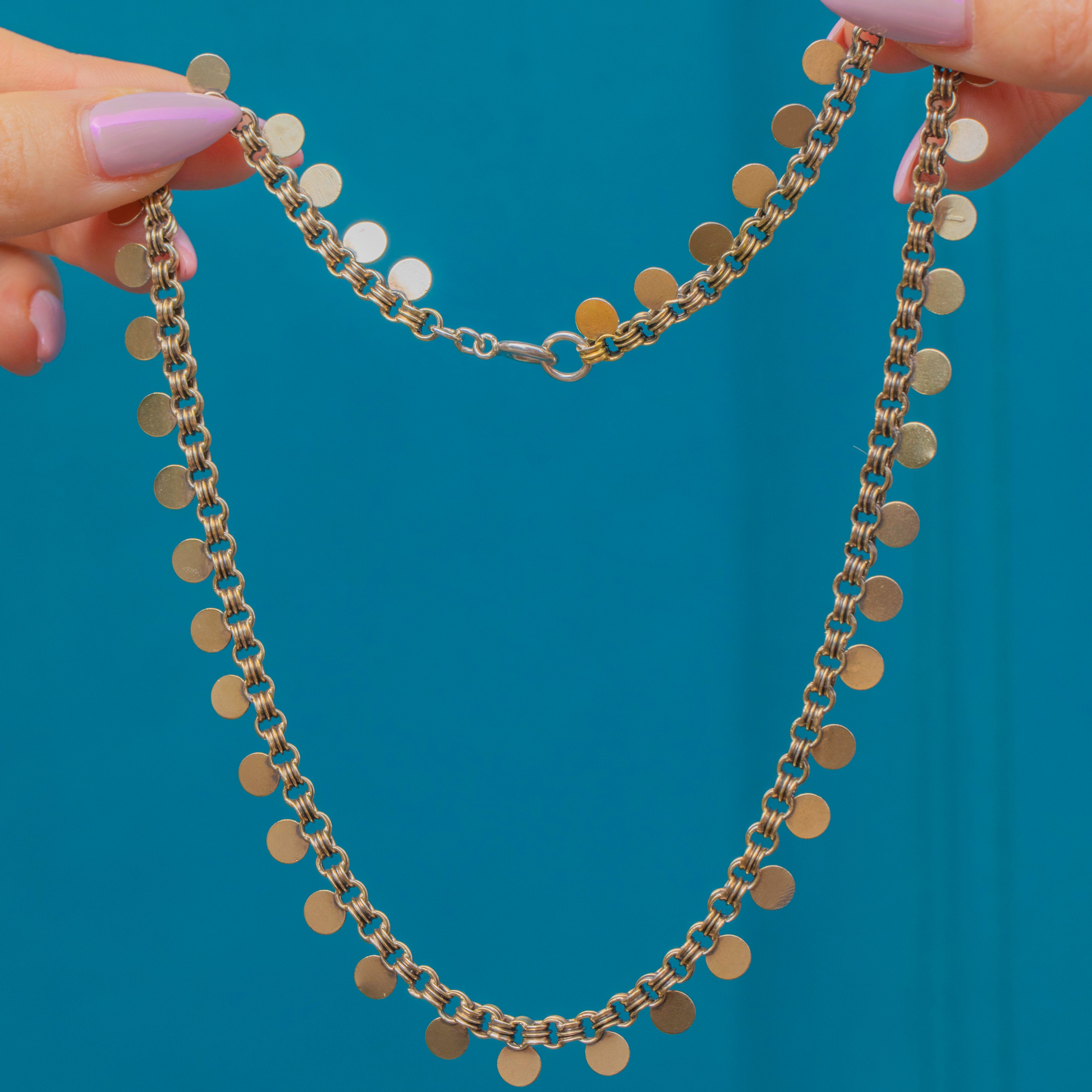 A striking Victorian Silver book chain necklace, featuring beautifully detailed “coin” style links and a large bold bolt-ring clasp. Each rounded link is smooth and glints in the light, giving the piece wonderful texture and visual interest.