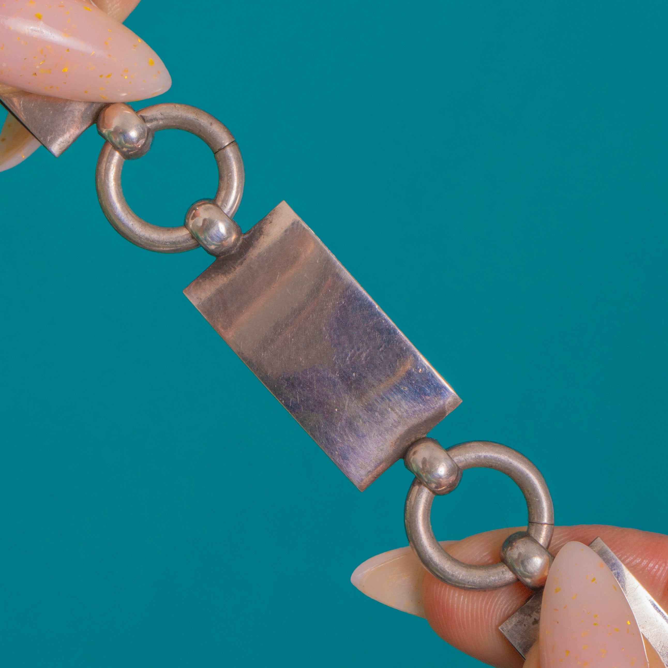 Bold and beautifully architectural, this Victorian book chain necklace is composed of alternating rectangular plaque links and chunky round connectors for a striking, collarbone-skimming silhouette. Each plaque is richly detailed with a raised beaded lattice framed by crisp reeded borders, the oxidised recesses adding depth and drama to the Silver sheen. Two oversized bolt rings complete the look—one forming the clasp and a second at the front acting as a decorative drop or practical hanger for a pendant or locket.