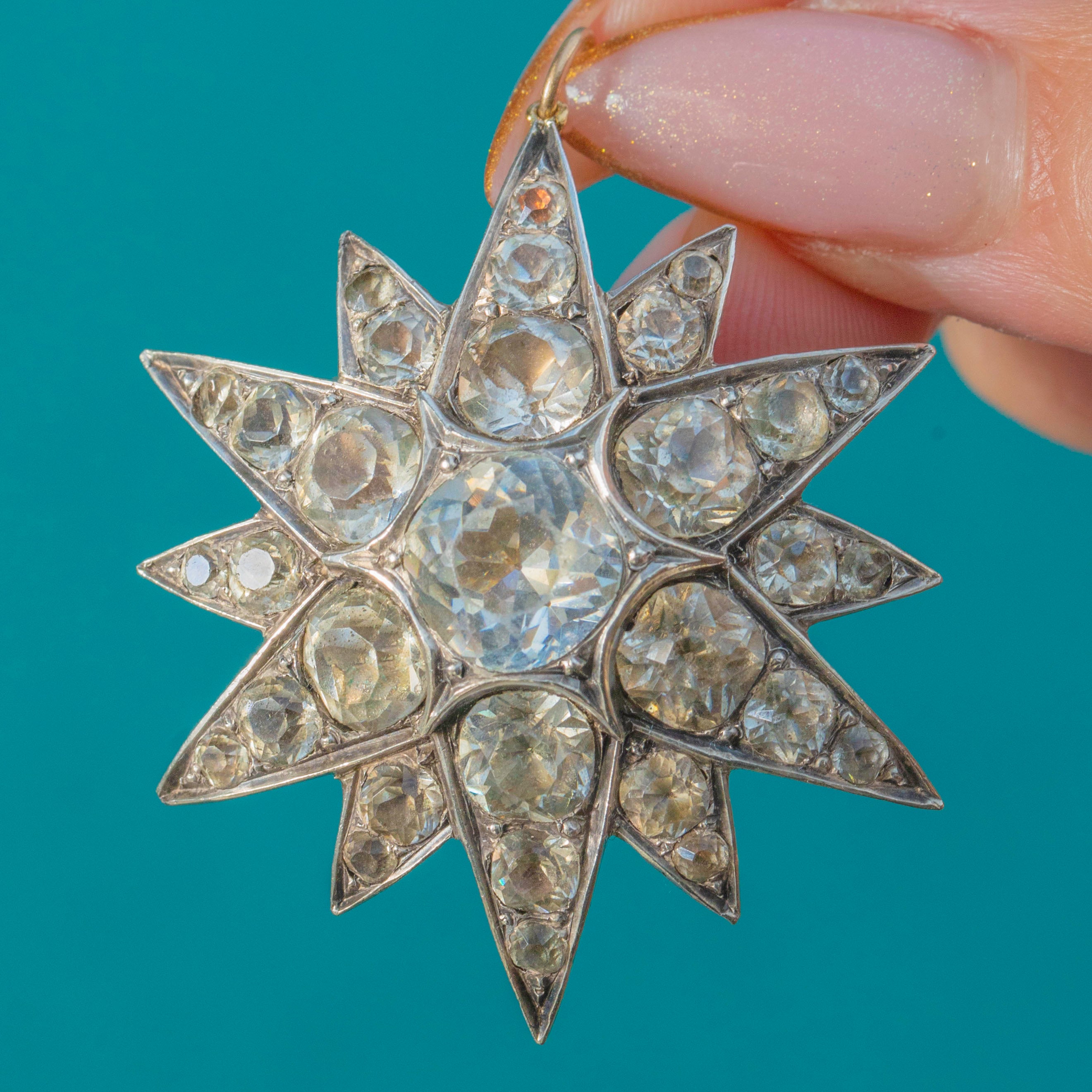 The stones are set in a Silver star-shaped mount, while the jump ring is 9ct Gold, giving you that classic mixed-metal Victorian look. Bright, sparkling, and full of period charm, it’s a spectacular example of antique Paste jewellery.