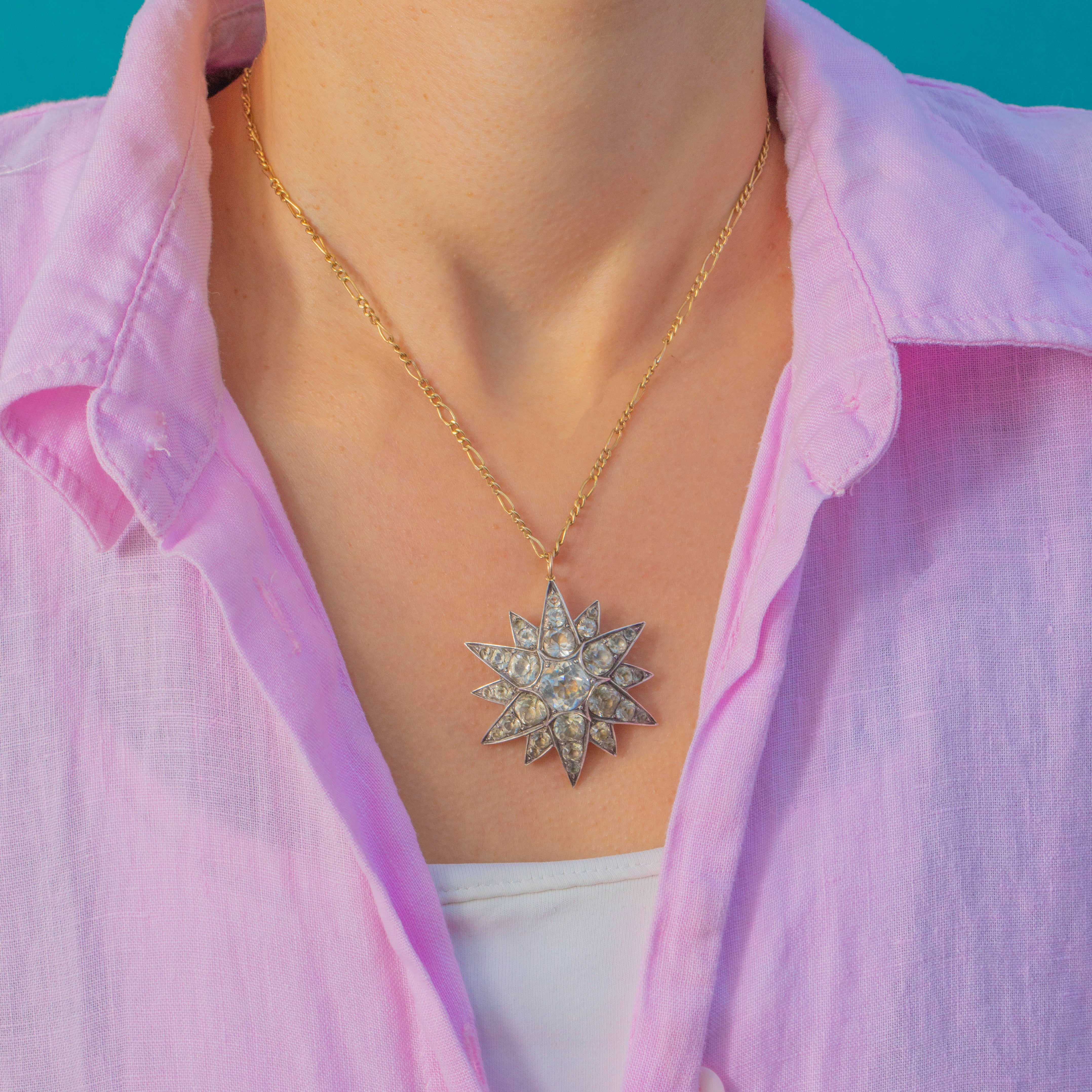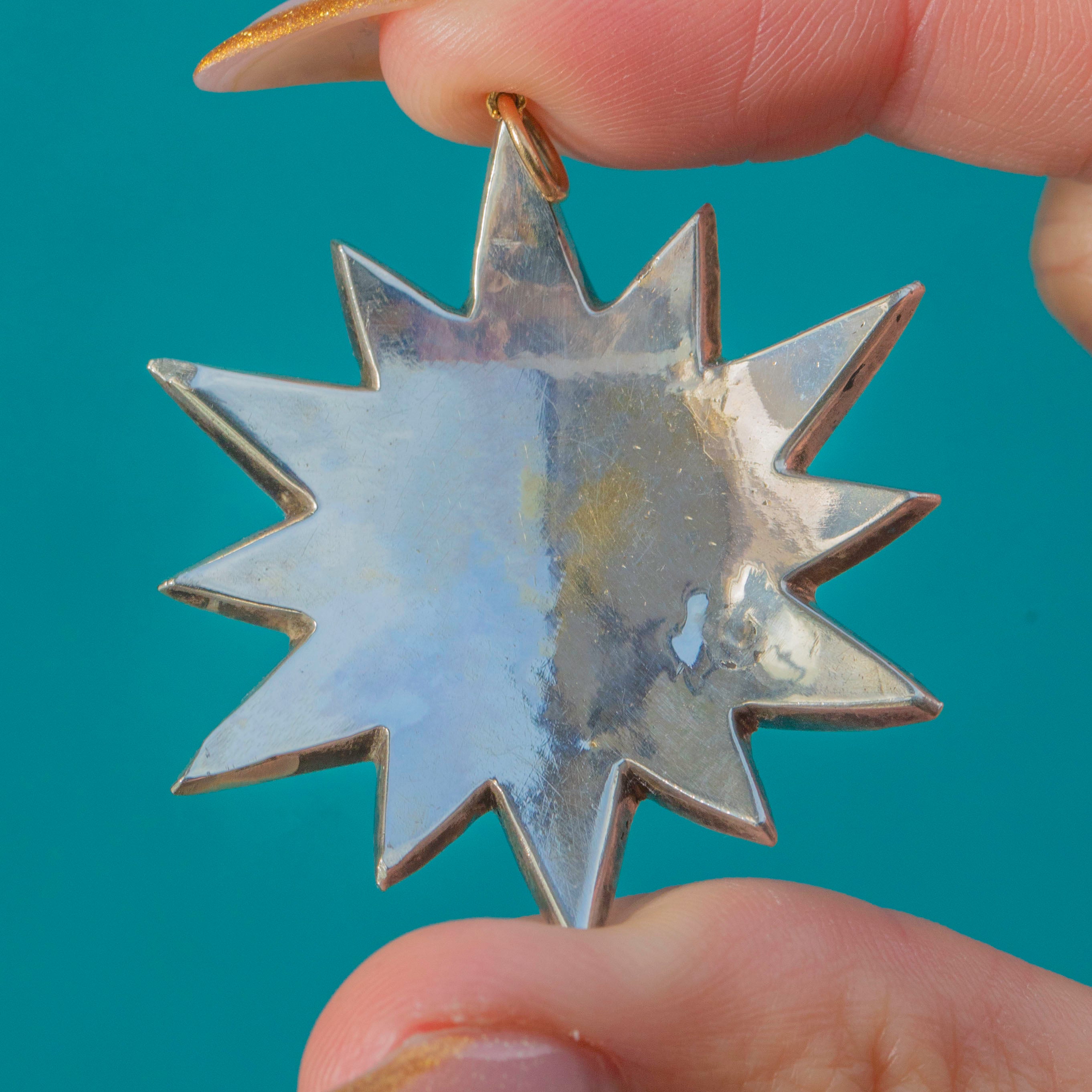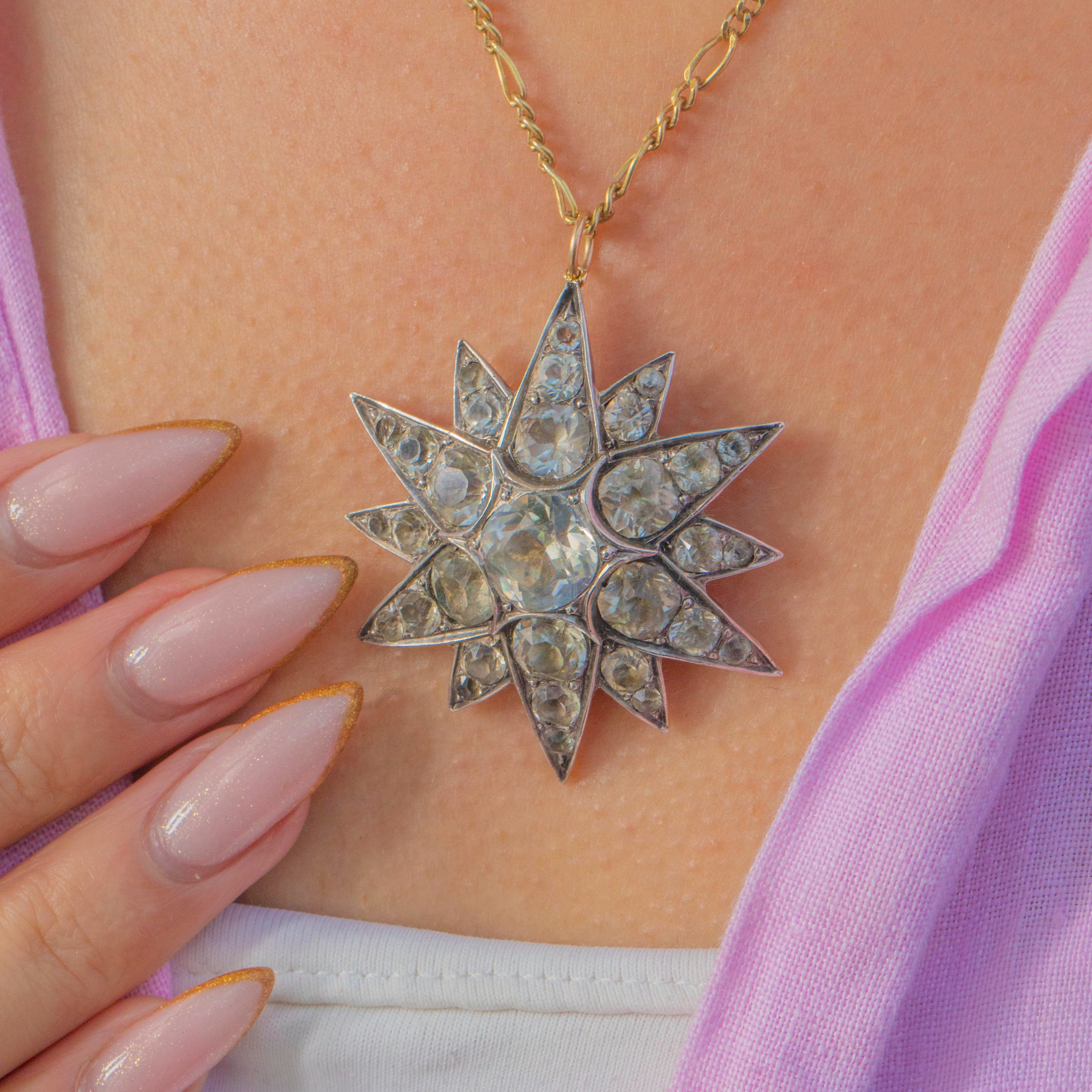 This magnificent Victorian Paste star pendant is a true celestial treasure. Crafted in a bold twelve-pointed starburst design, each ray is set with glittering graduated Paste stones that catch and reflect the light beautifully. Its large scale and dramatic presence make it an unforgettable statement piece, worn as a pendant or added to a long antique chain.