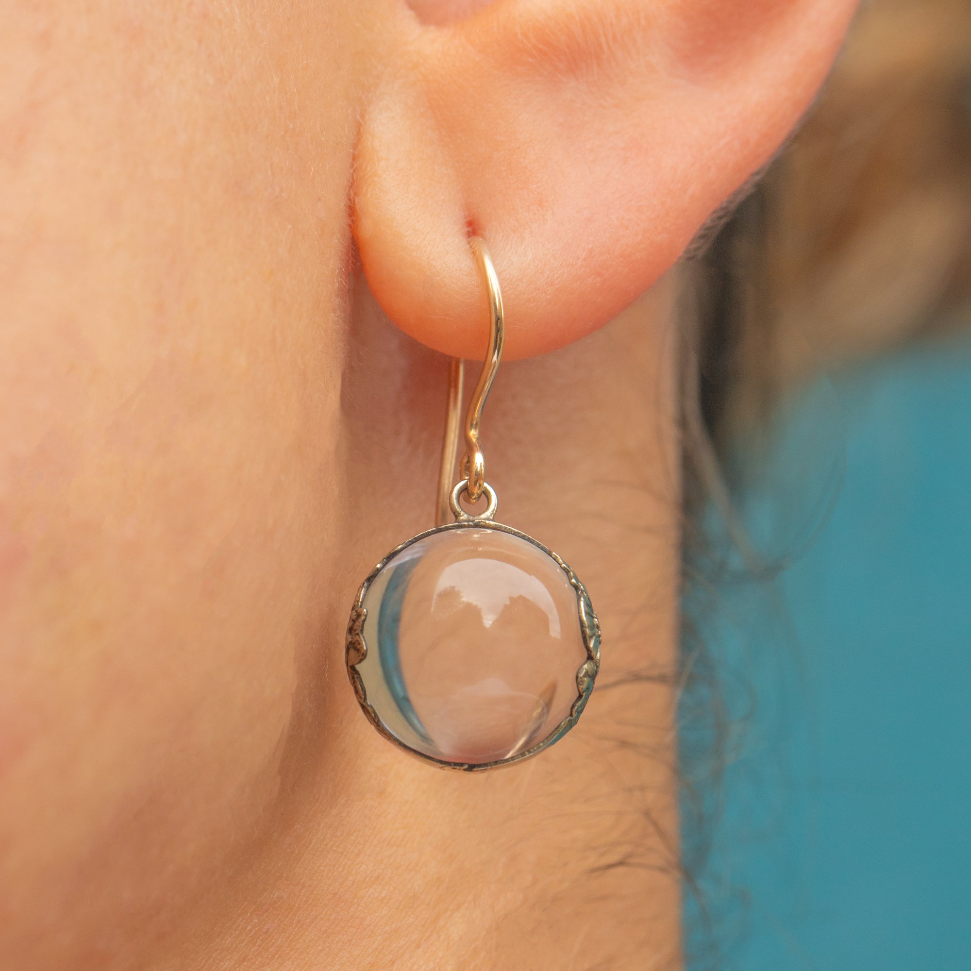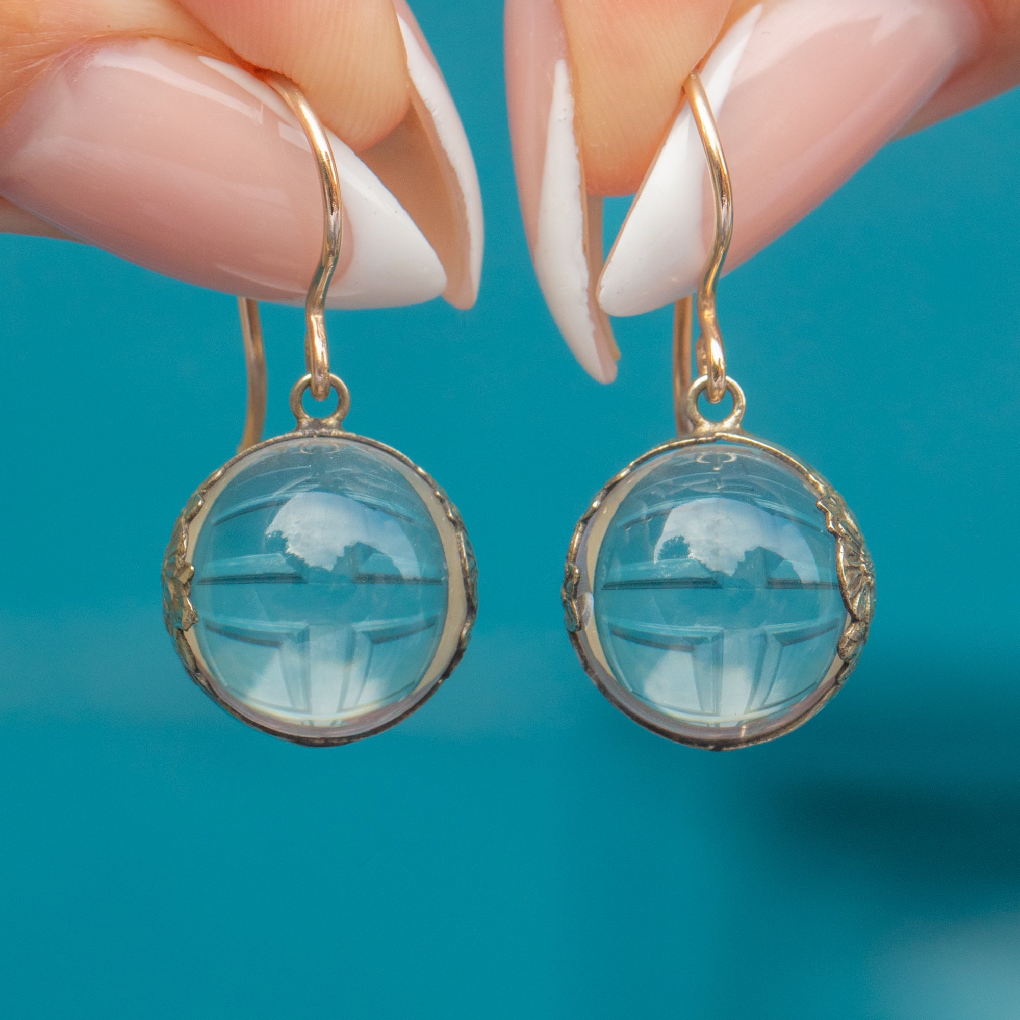 A dreamy pair of Victorian “Pools of Light” earrings, featuring luminous Rock Crystal orbs that seem to capture and magnify the world within them. The clear, spherical crystals have a mesmerising quality, appearing almost to glow from the inside as they catch the light with every movement. They are beautifully mounted in Sterling Silver with delicate floral motifs, and finished with 9ct Gold hooks for comfort and elegance.