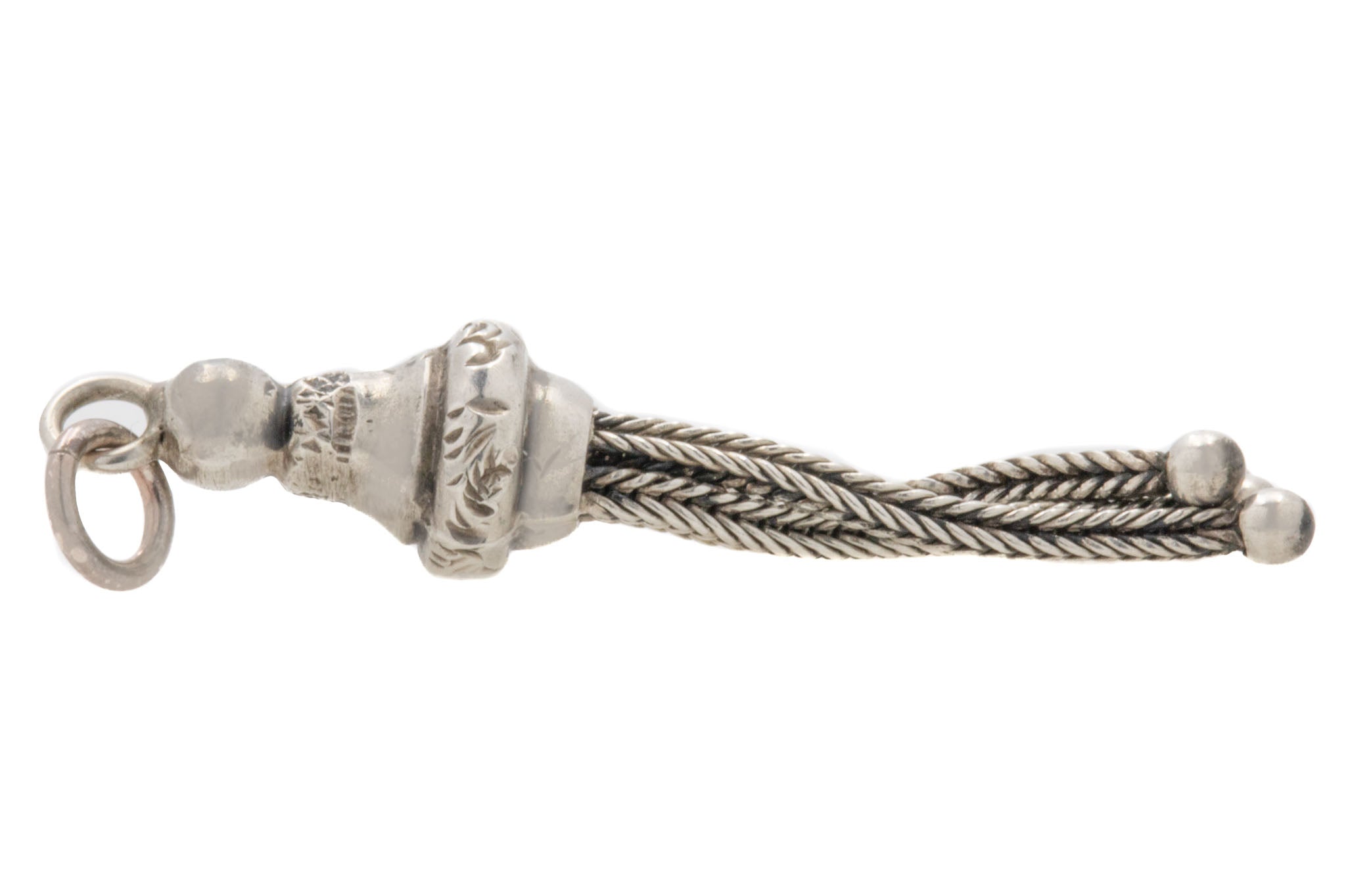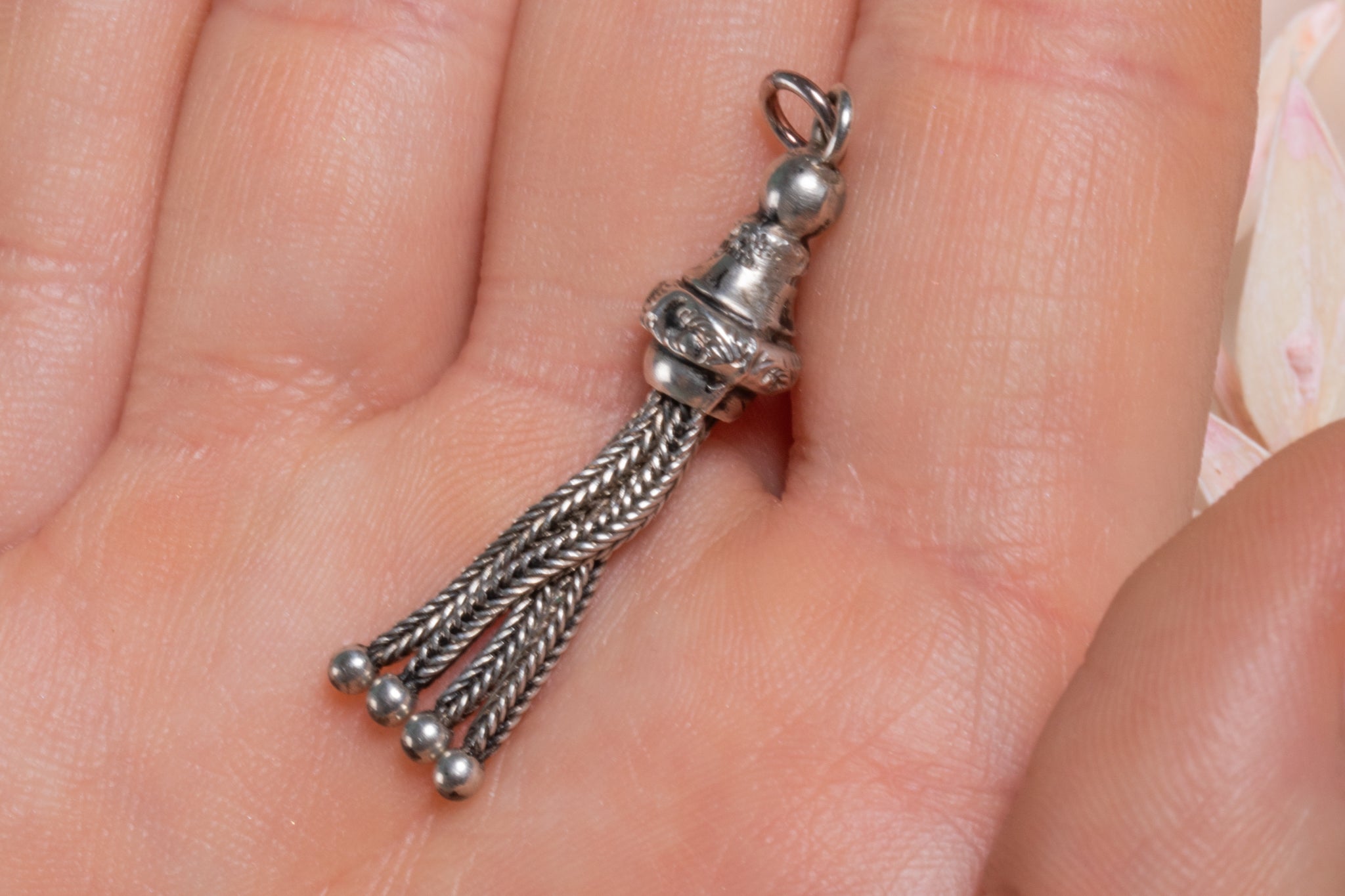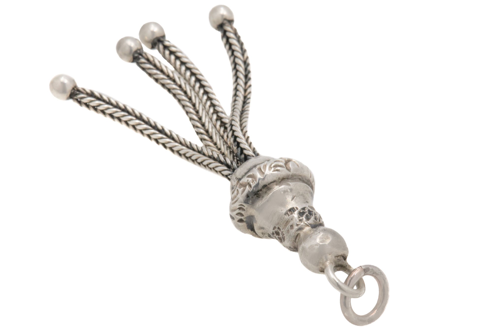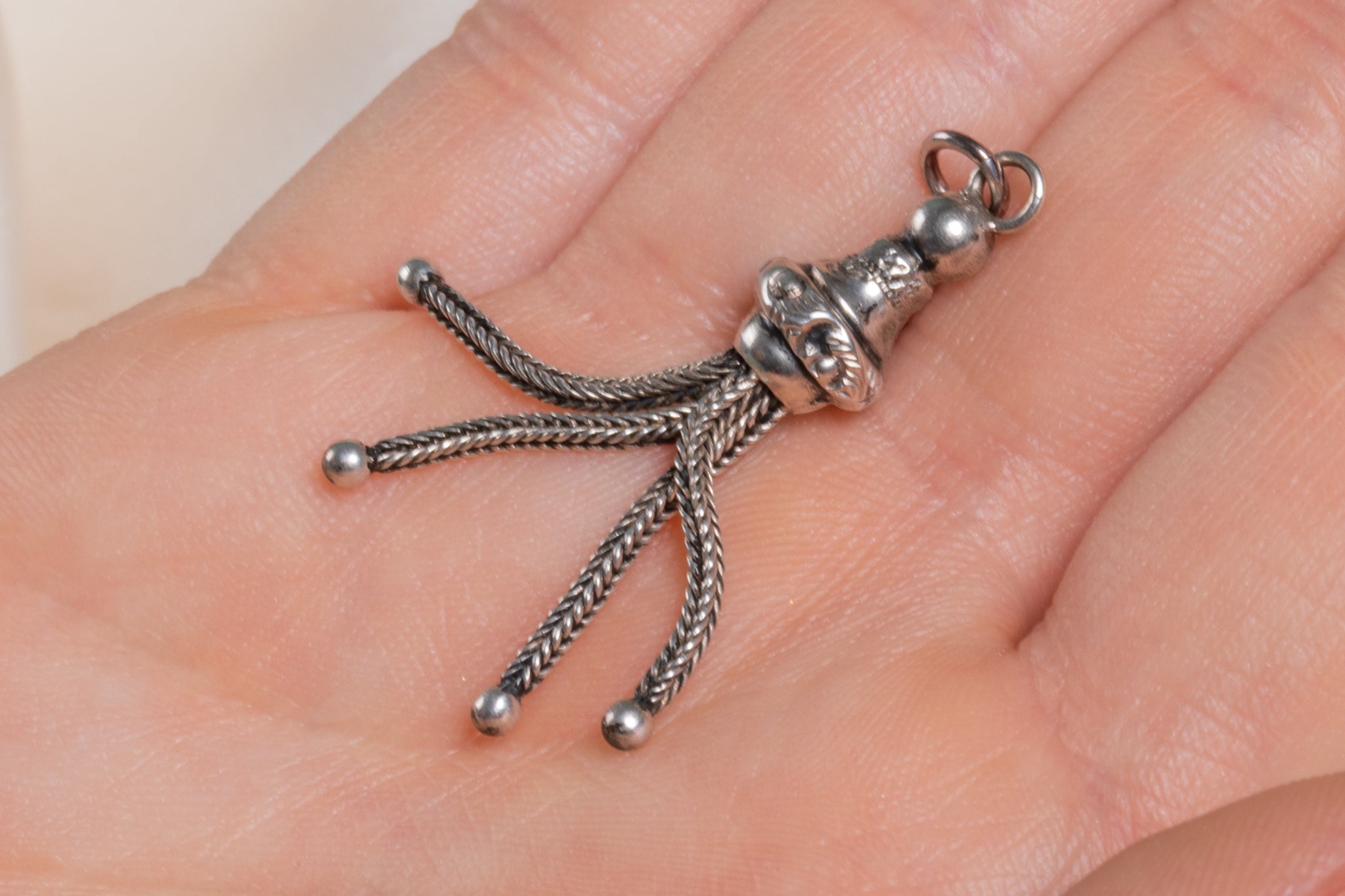 EXCELLENT. This Victorian Silver tassel pendant is in excellent condition. The Silver is stunning, and doesn't have any damage to note! The engraved dome is intact and each tassel is complete with ball endings making her a fabulous must-have for your collection!