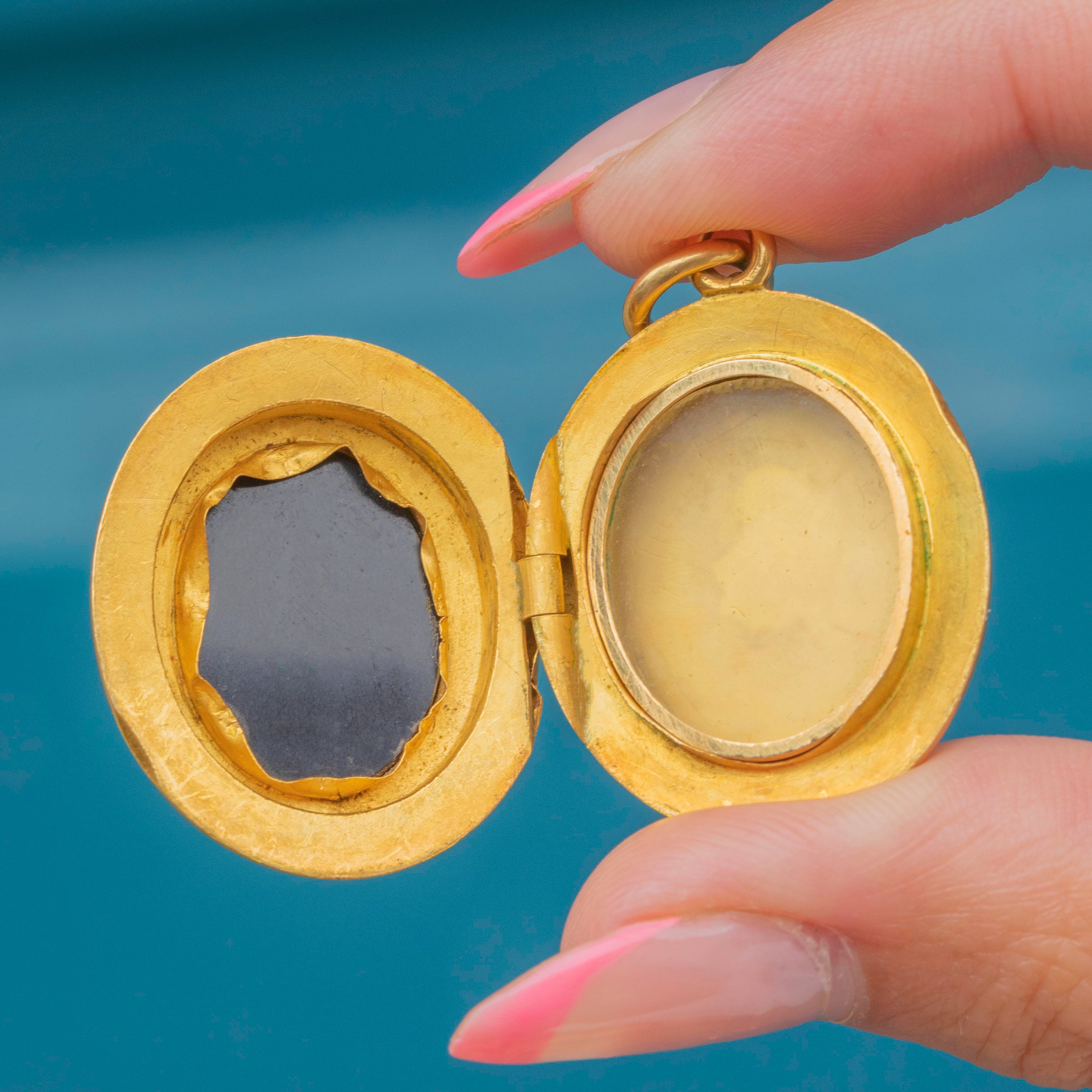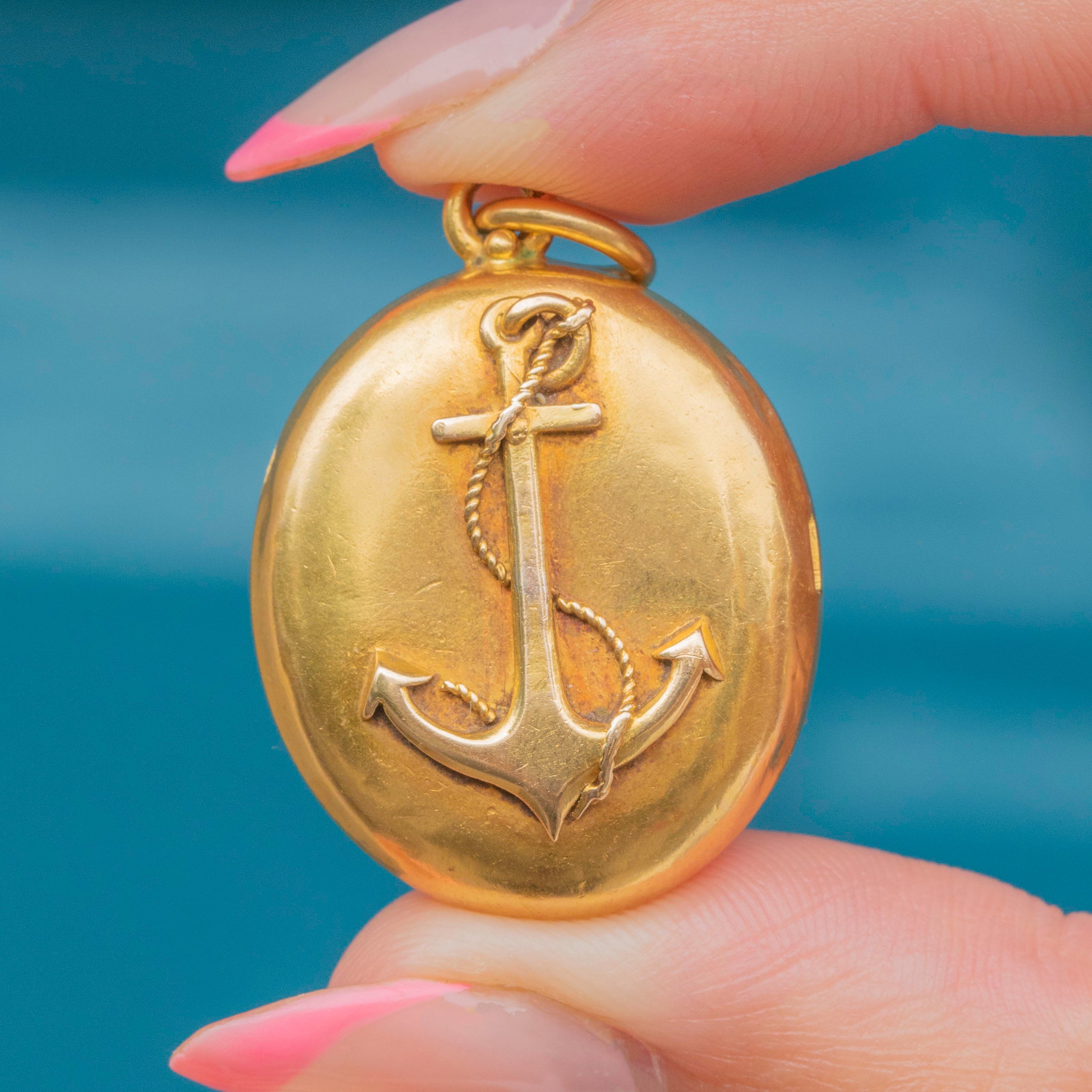 VERY GOOD: This Victorian solid 18ct Gold Banded Agate anchor locket is in very good condition. The Gold is brightly saturated throughout and all the details have remained defined. There are some mild dings around the outside of the locket, commensurate with age, but these aren't particularly noticeable when looking front on. The Banded Agate is smooth and securely set, free from chips or scuffs. Closing securely and with the original picture frame intact, you can use and wear this antique anchor locket with utmost confidence!