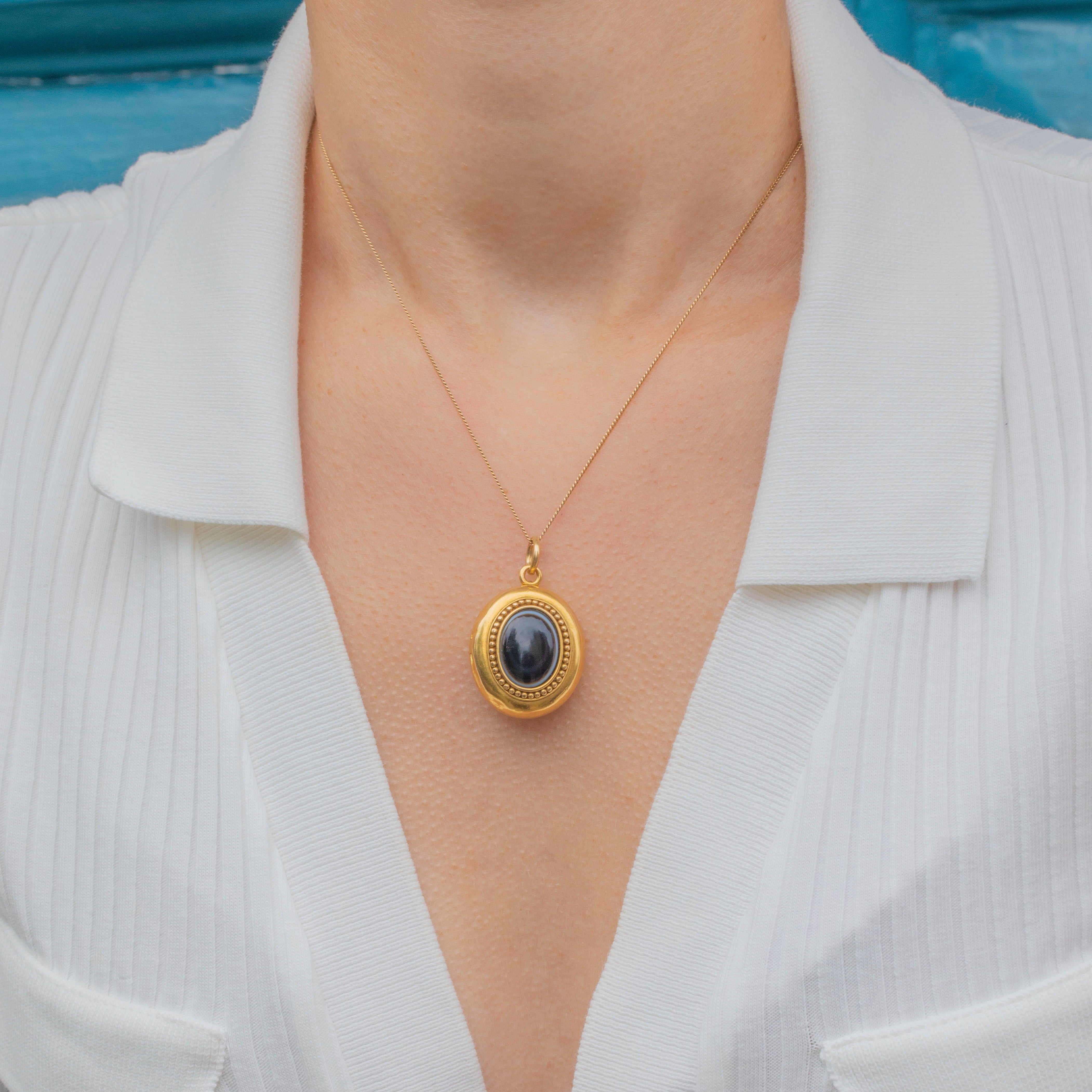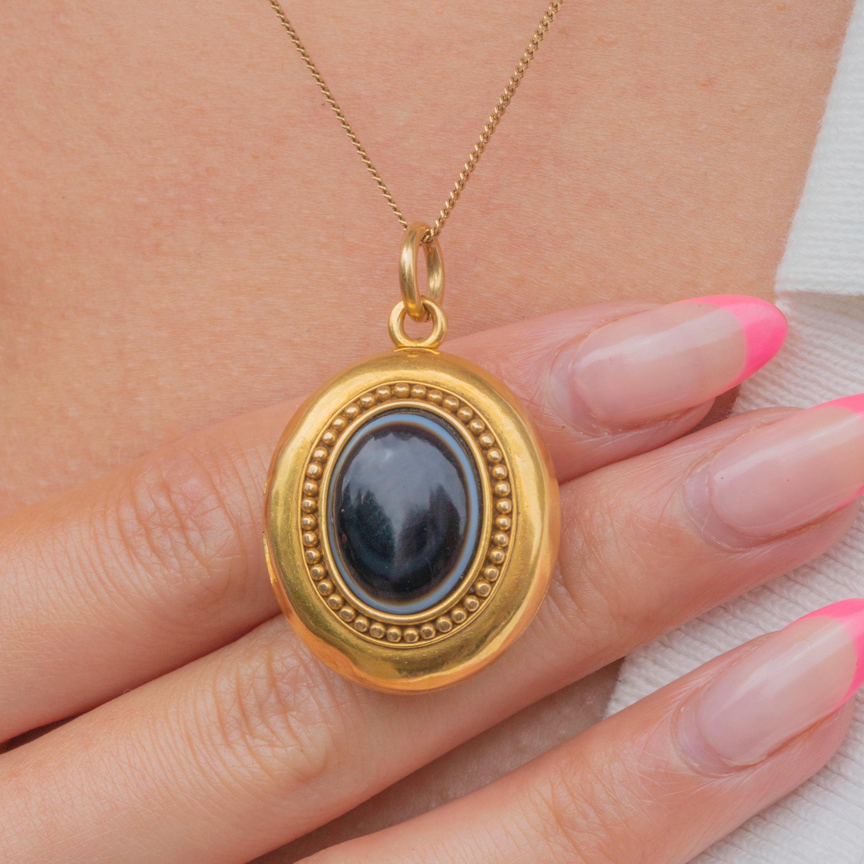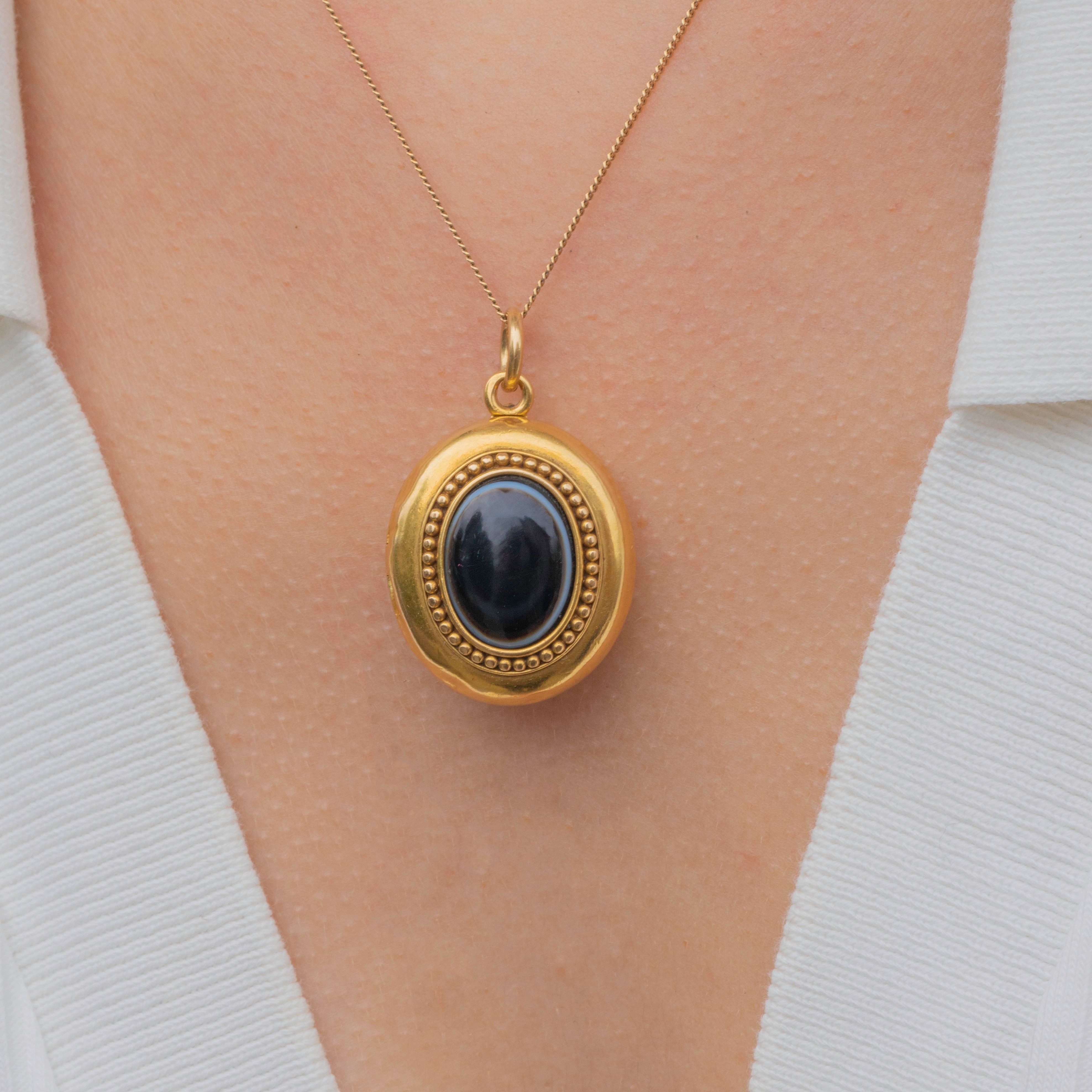 A smooth Agate cabochon is inlaid on one side, with a characteristic white "bullseye" band running around its circumference, framed by beaded details for a striking finish. The other side is decorated with an anchor, symbolic of love and hope, imbuing this Victorian locket with romantic sentiment.