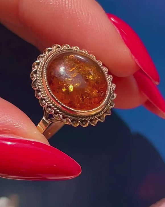 EXCELLENT. We are pleased to present this Vintage 9ct Gold Amber ring in excellent condition! The Amber is secure within her setting and the inclusions make her even more sensational. The Gold is in perfect condition throughout and has retained its structural integrity for comfortable wear.
