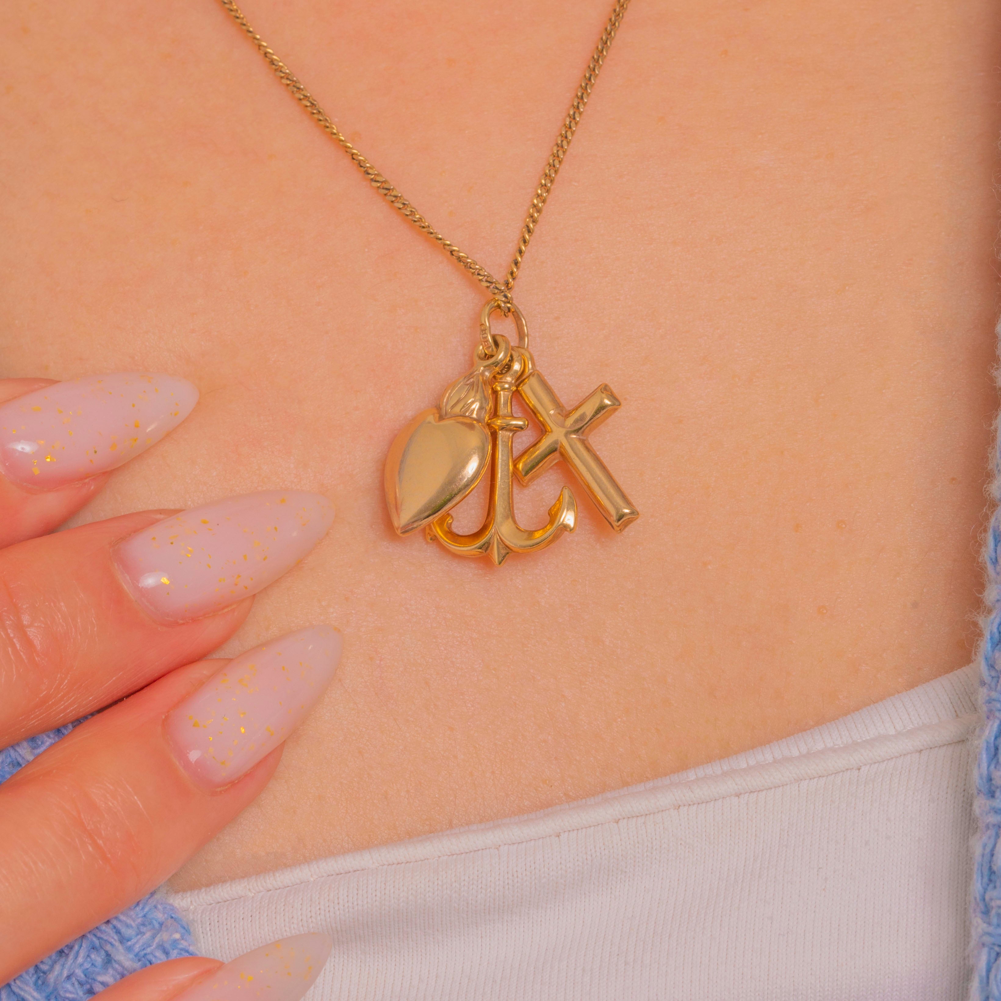 A sweet Faith, Hope & Charity charm pendant in 9ct Gold, this petite cluster brings together an anchor, a rounded Latin cross and a puffed heart for timeless sentiment in a sleek, minimalist form. Each charm gleams with a high polish, gathered on a shared jump ring for effortless movement and shine.