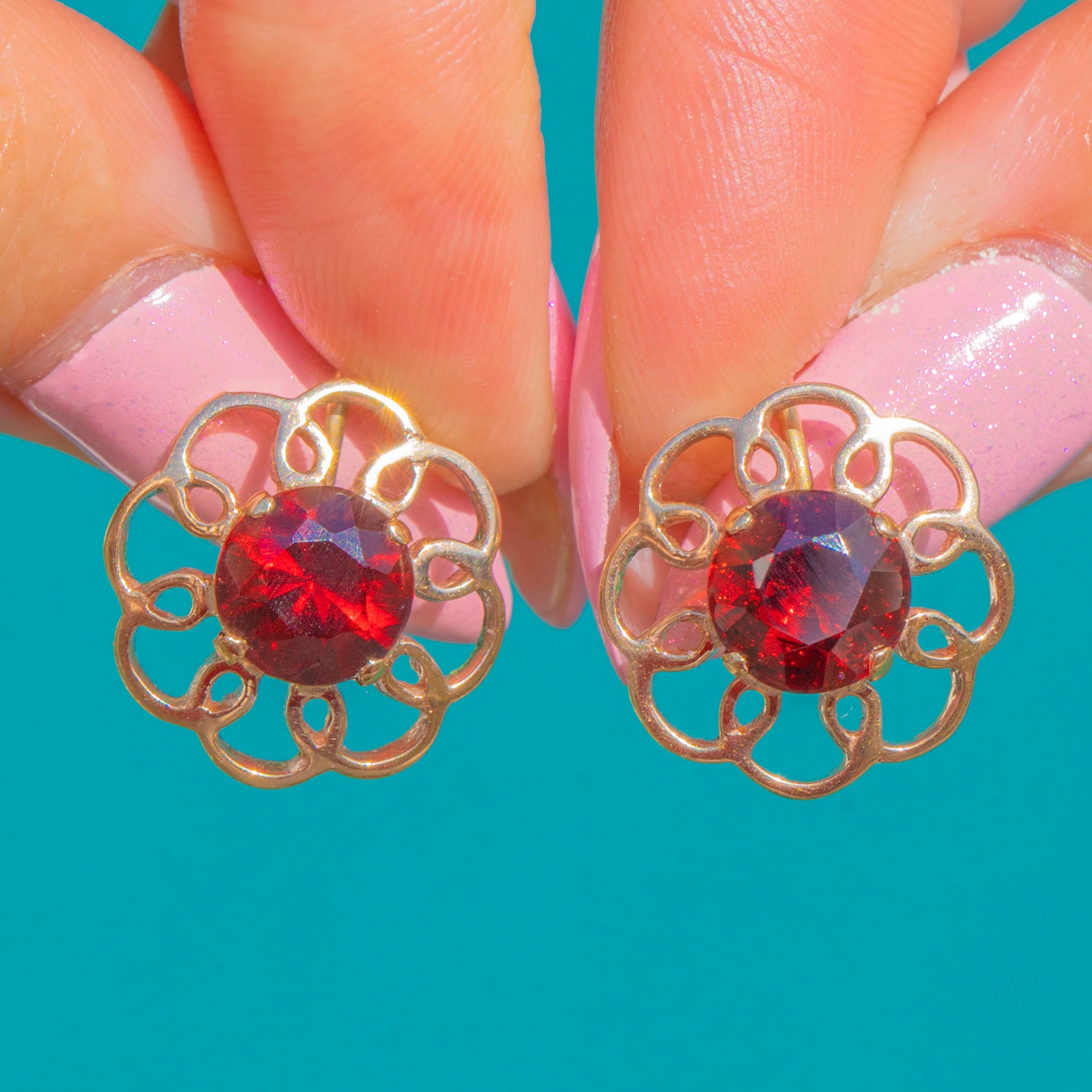 Shaped as delicate rosettes in warm 9ct Gold, these Vintage flower earrings glow with richly hued round Garnets at their centre. The openwork petals lend a lace-like lightness, while the deep claret gemstones bring a luxurious pop of colour that flatters any complexion.