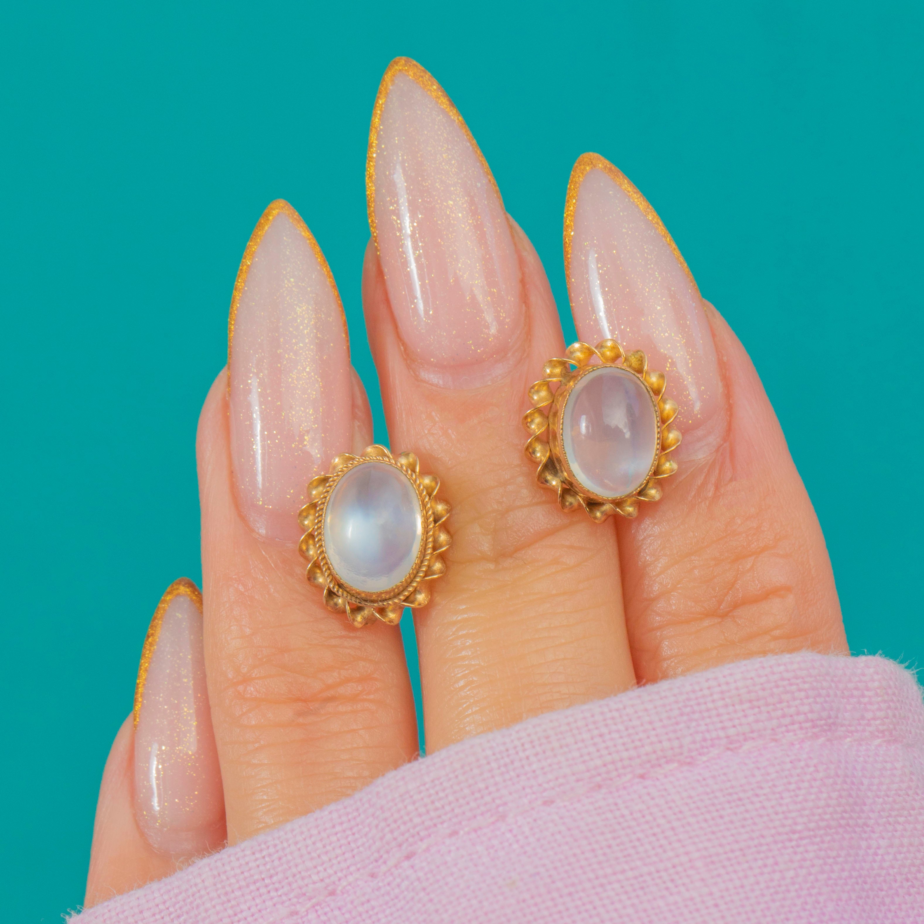 These Vintage 9ct Gold Moonstone studs are a charming 1970s design, each set with a soft, glowing Moonstone in a classic bezel setting. The warm Gold frames the cabochons beautifully, enhanced by a delicate rope-border detail for a touch of texture and vintage character.