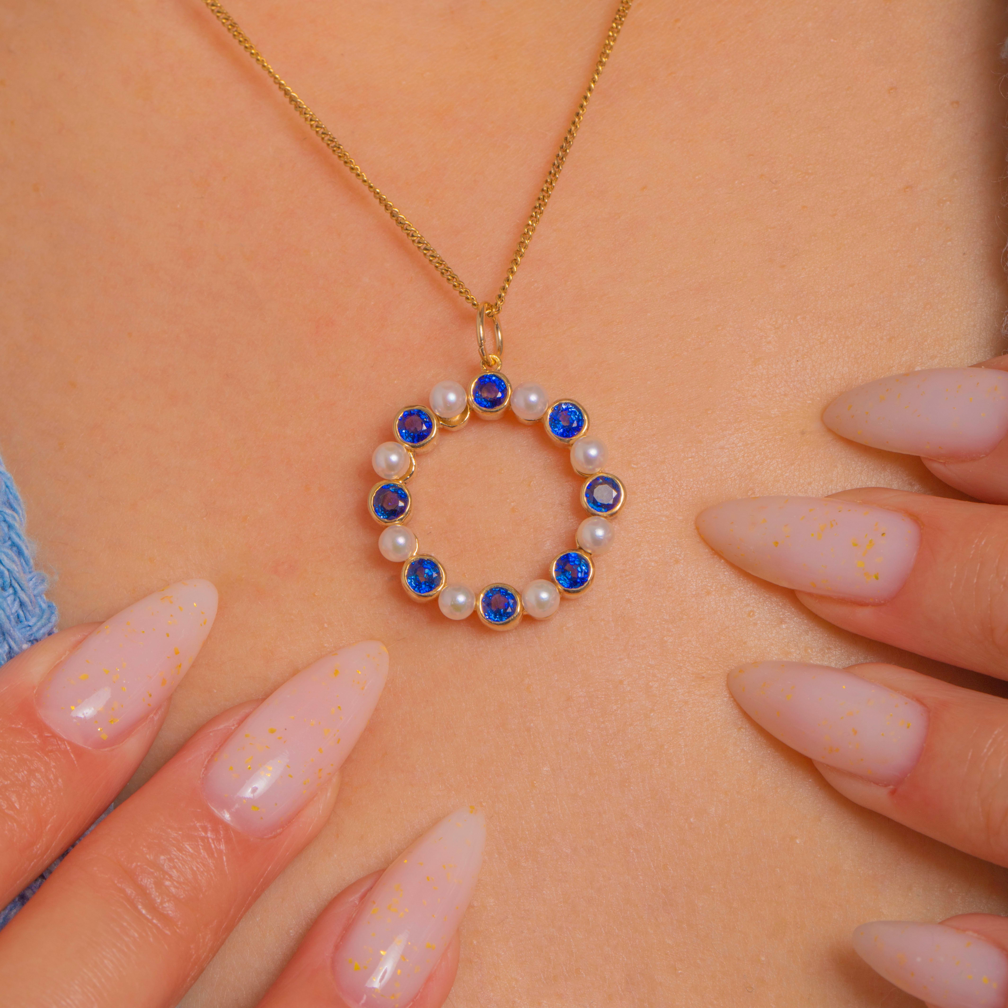 A chic Vintage wreath pendant in 9ct Gold, set with an elegant rhythm of round faceted Sapphires and luminous Pearls. The Sapphires are neatly embraced by smooth rub-over collets, creating a refined halo with a scalloped inner contour and a beautifully polished, golden glow.