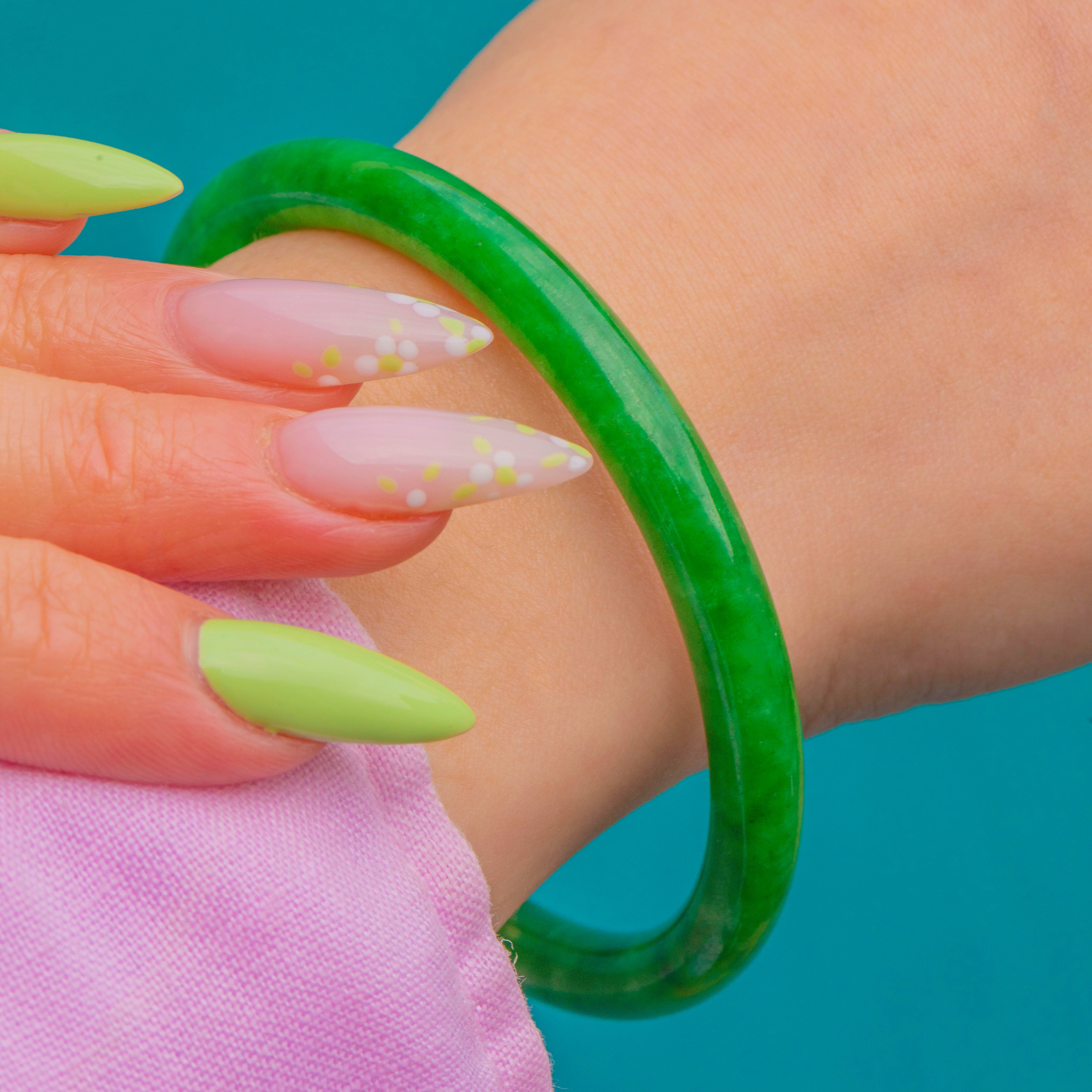A timeless classic in verdant green, this Vintage Nephrite Jade bangle is carved from a single piece and polished to a sleek, high-gloss sheen. Its seamless circular form and rounded profile let the stone’s natural mottling and gentle translucency take centre stage.