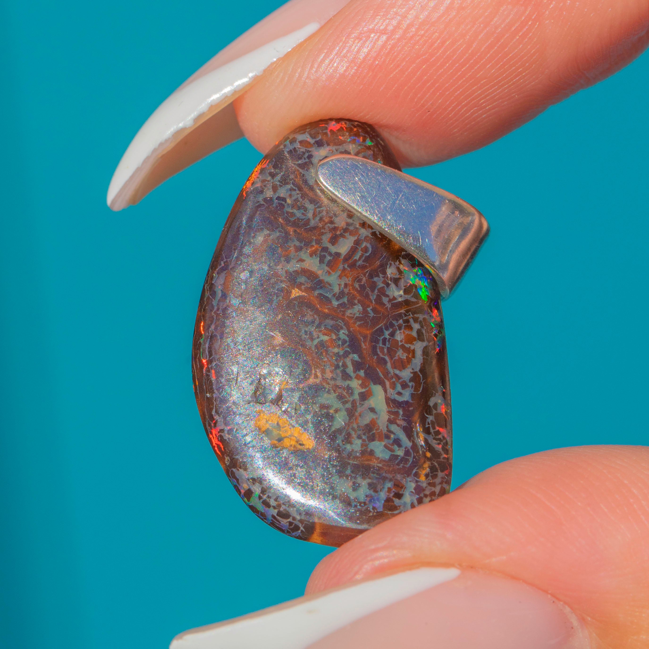 This striking Vintage pendant features a natural Opal Matrix cabochon with flashes of green and blue fire against a rich earthy brown ground. Its organic "bean" shape is smooth and tactile, making it a wonderfully unique and wearable piece of jewellery.