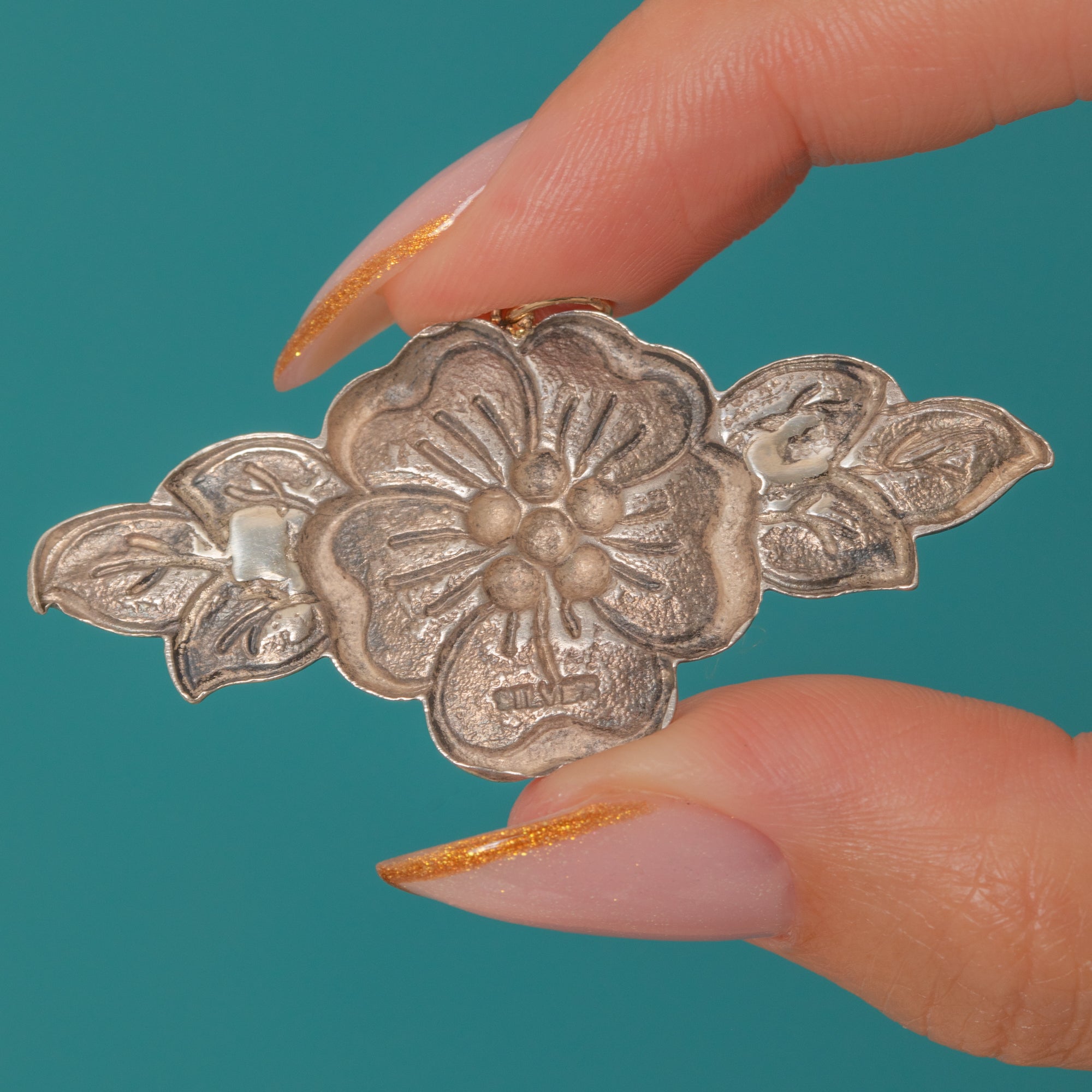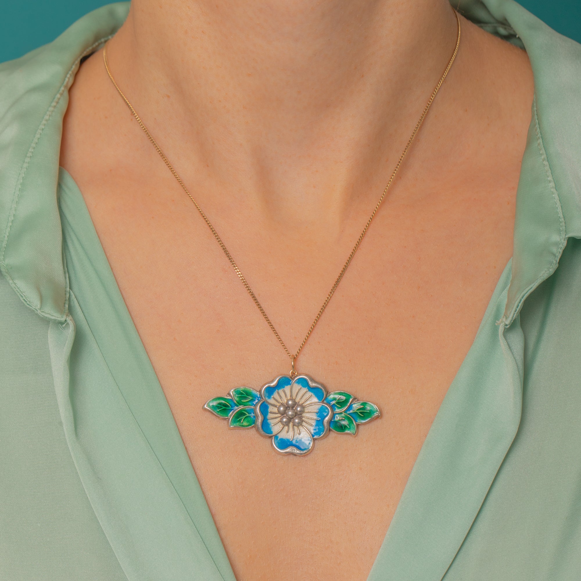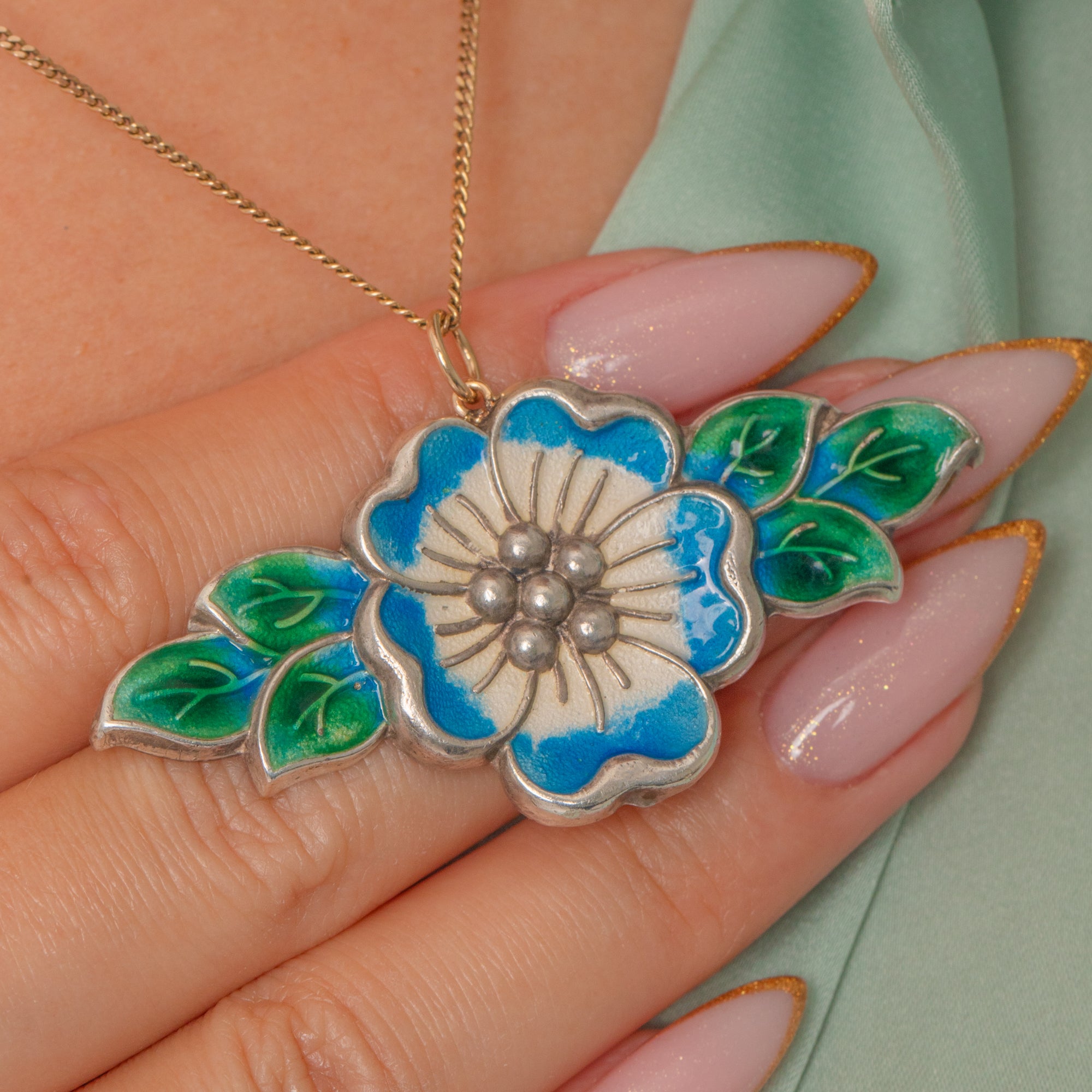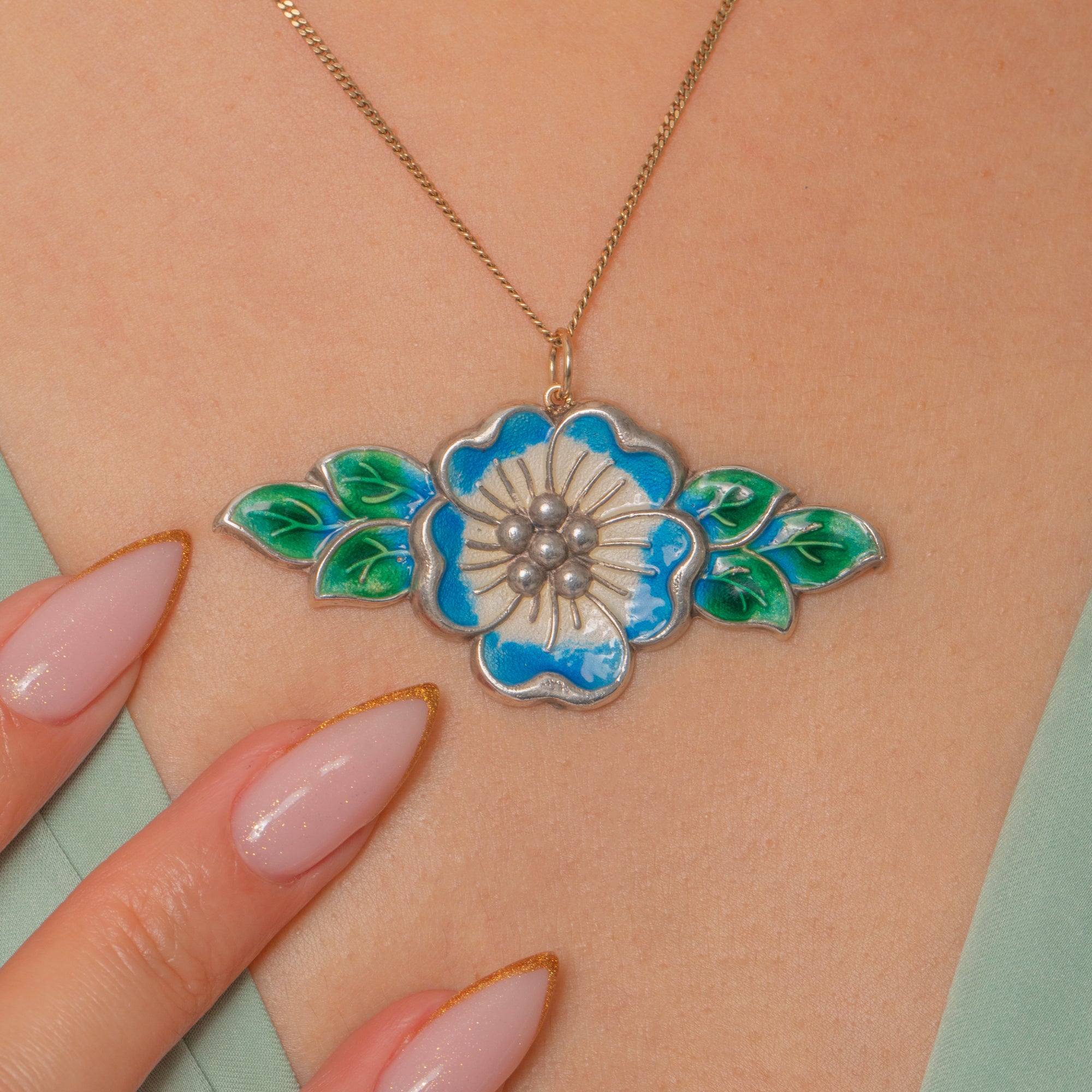 This colourful Vintage pendant showcases a beautifully Enameled primrose flower framed by glossy green leaves. Crafted in Silver, the petals fade from soft white to vivid sky blue, while the centre is detailed with polished Silver bead stamens. Each leaf is finished in rich shades of green, outlined in Silver for definition.