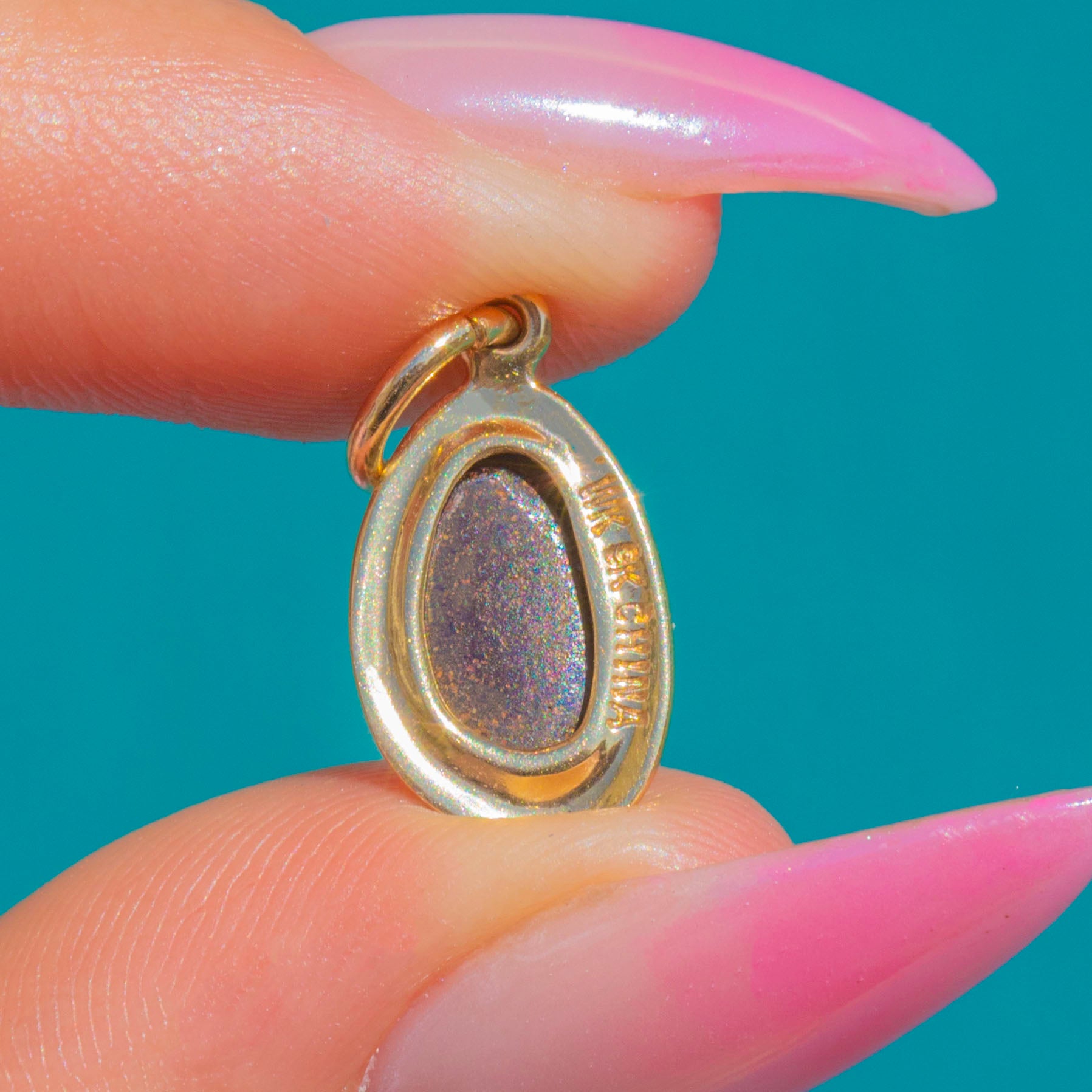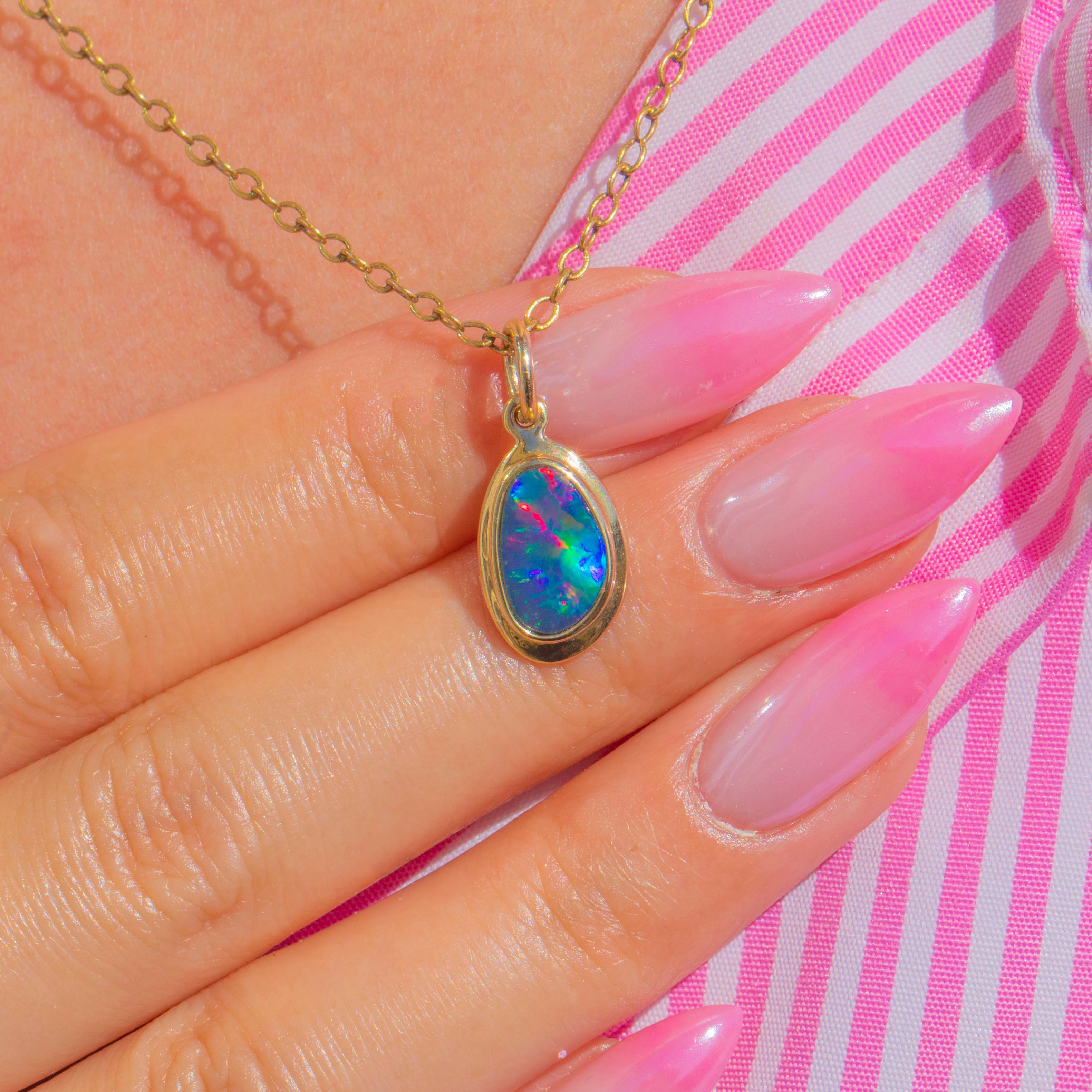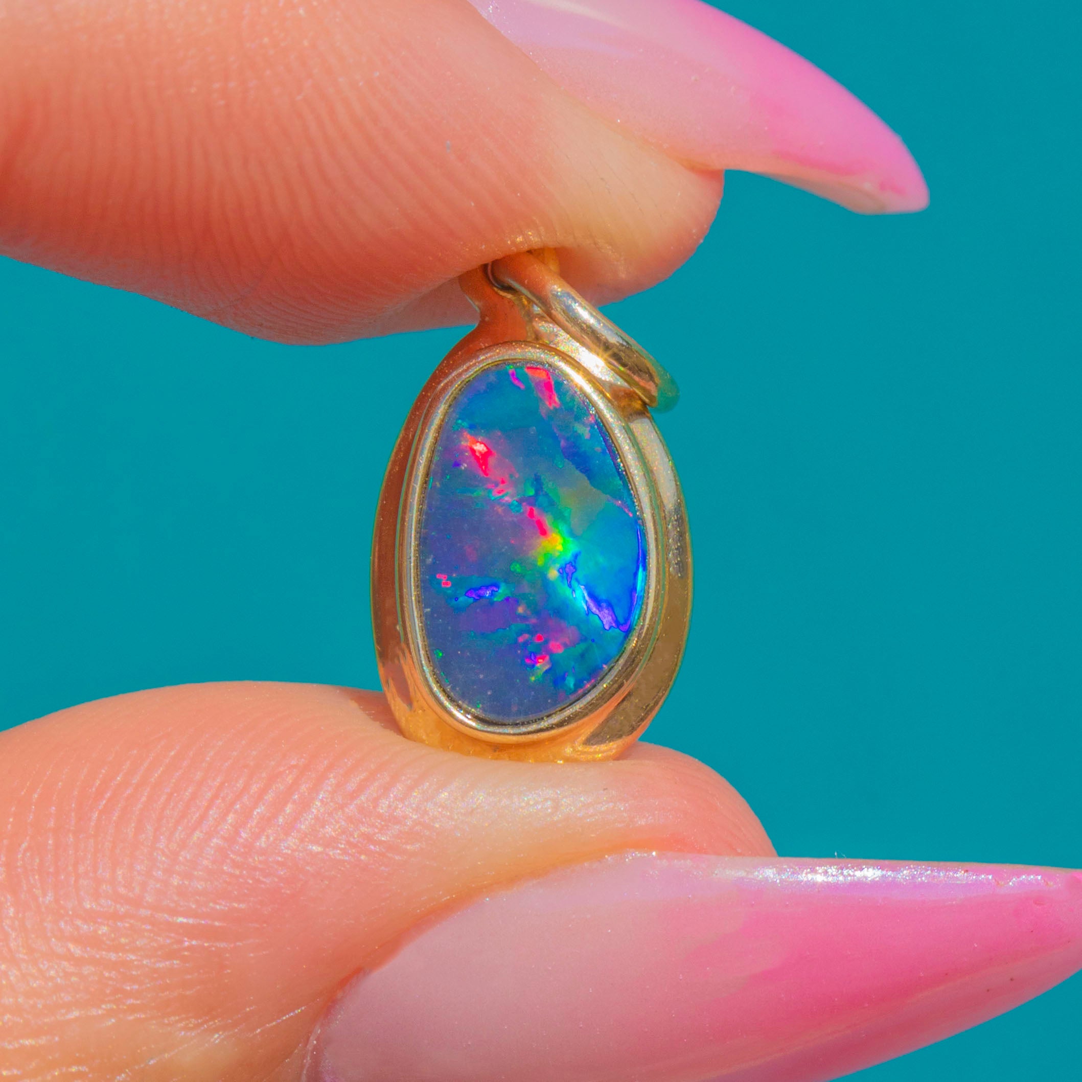 EXCELLENT: The Opal is bright with no visible chips or cracks, showing only the lightest surface wear under magnification. The Gold bezel and bail are smooth and well preserved with faint surface scratches to the jump ring consistent with gentle wear. The setting is secure with no visible repairs.
